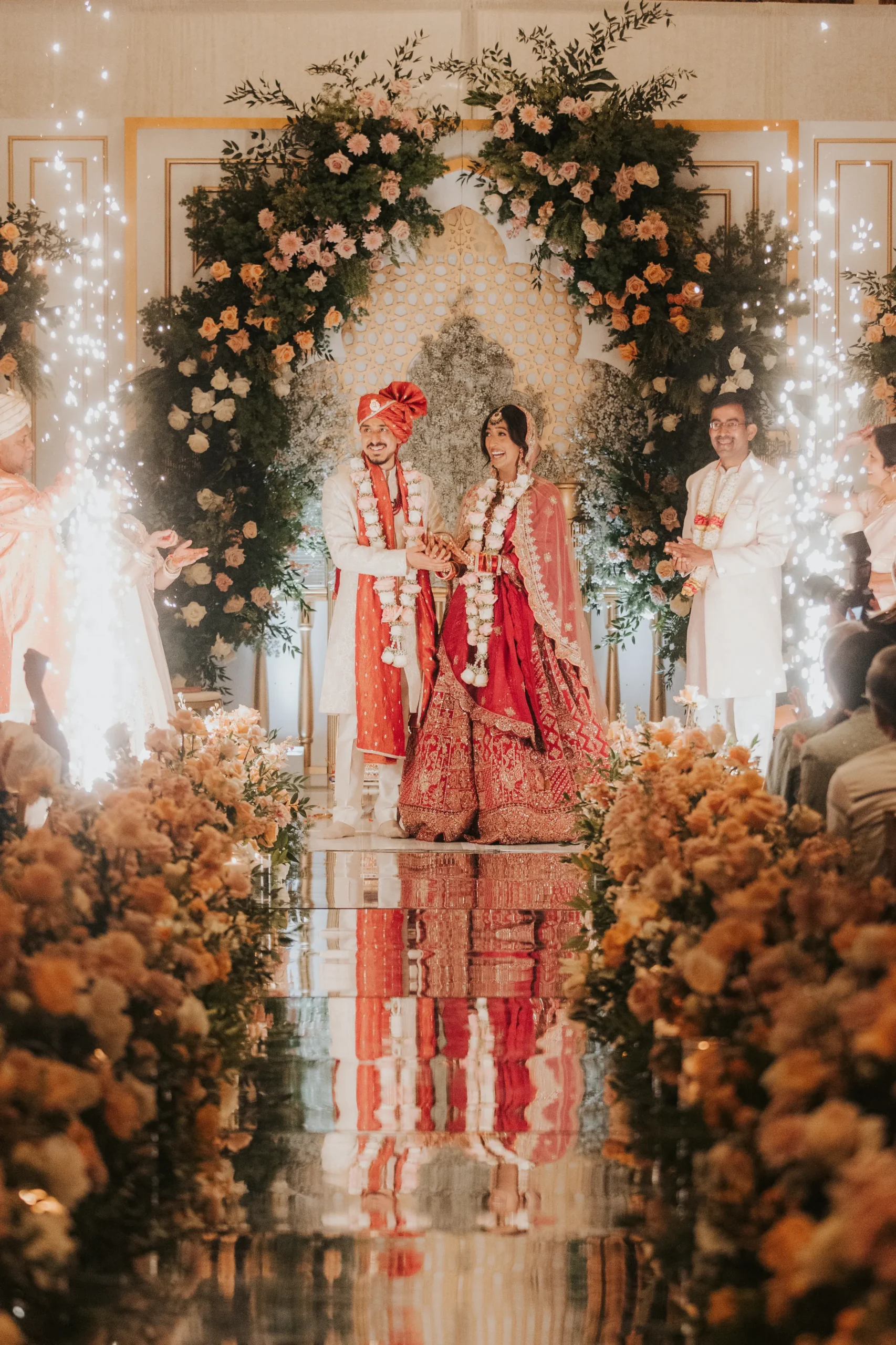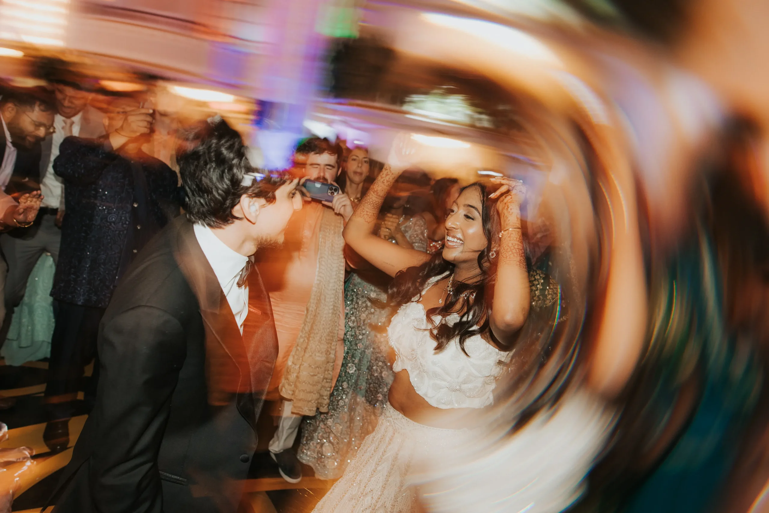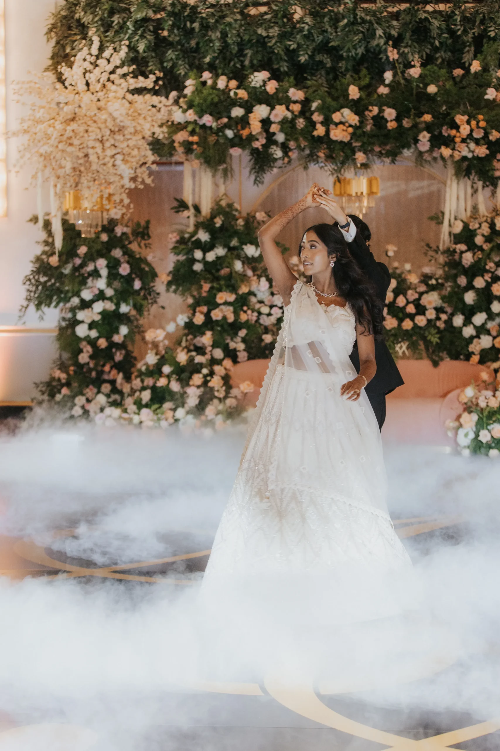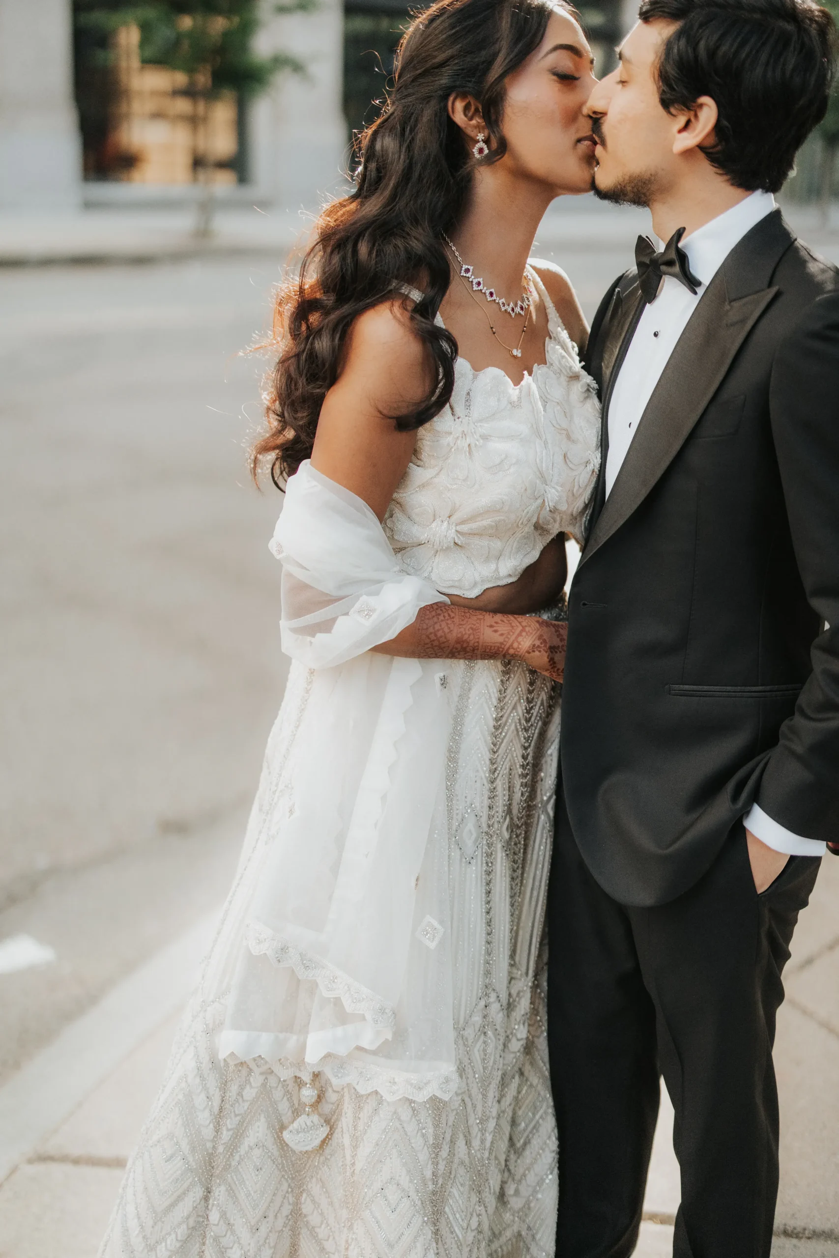For their ceremony, Akshayaa had worked with her designer to bring in installations from India. Their officiant, the Hindu influencer and educator Ranjani Saigal (The Hindu Grandma) wove together tradition and teaching to officiate a ceremony that was deeply rooted in Hindu practice while also teaching the traditions and practices to a diverse crowd of guests in ways that were full of levity and joy. In the end, they kissed under a shower of fireworks.