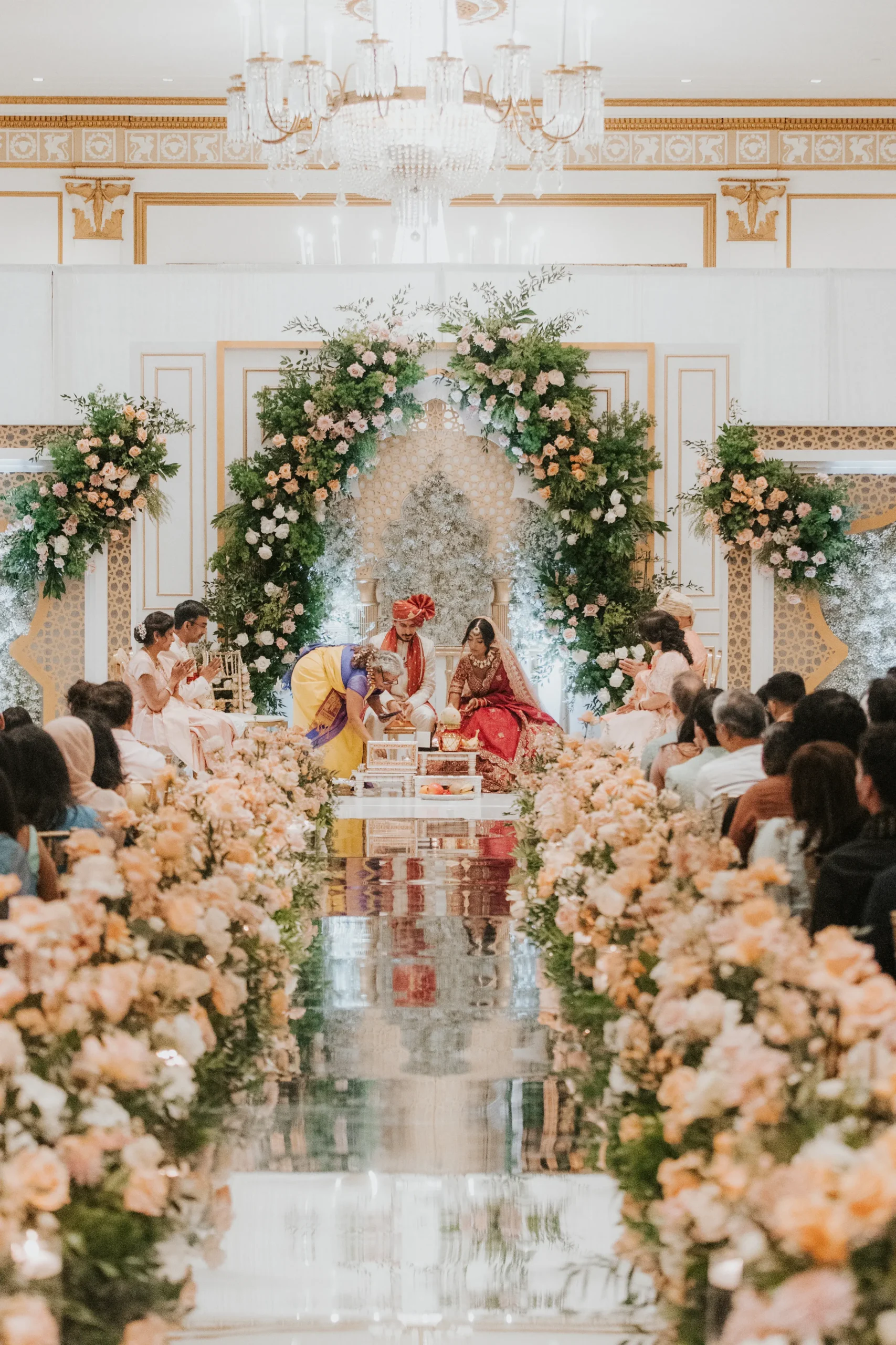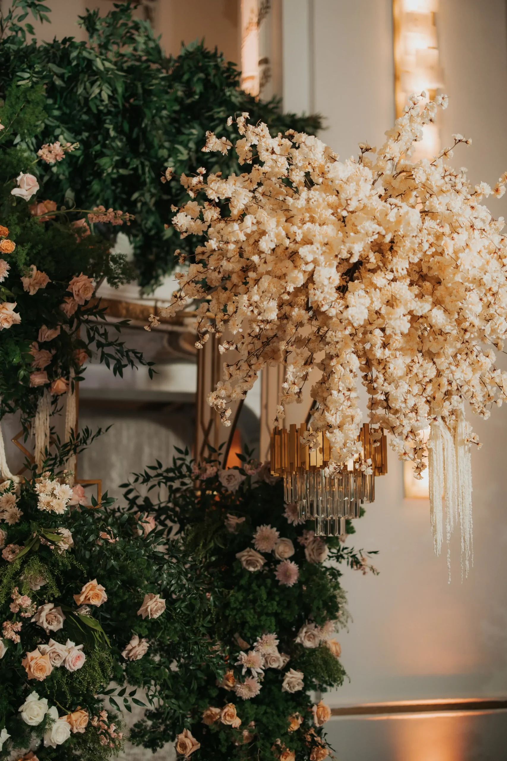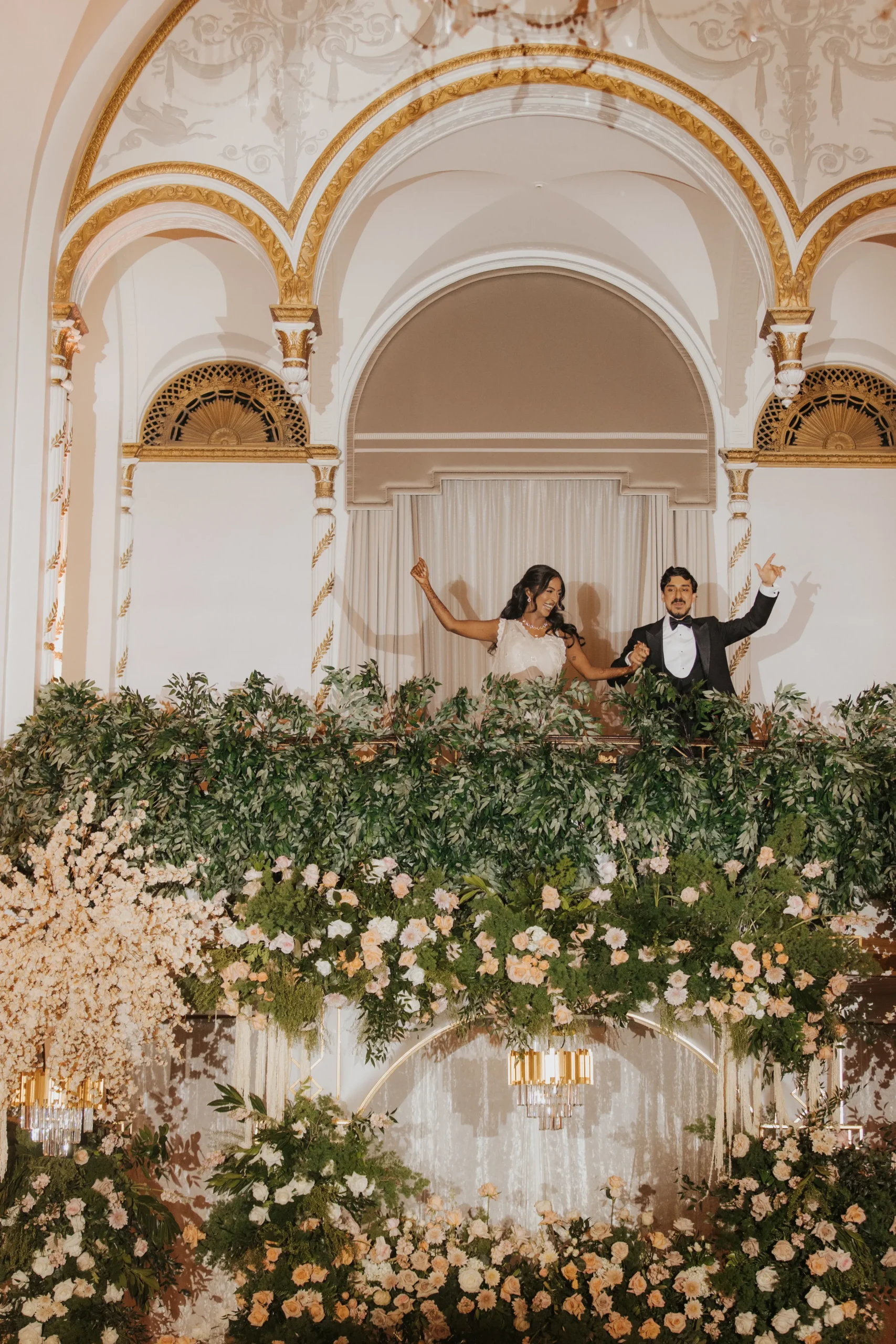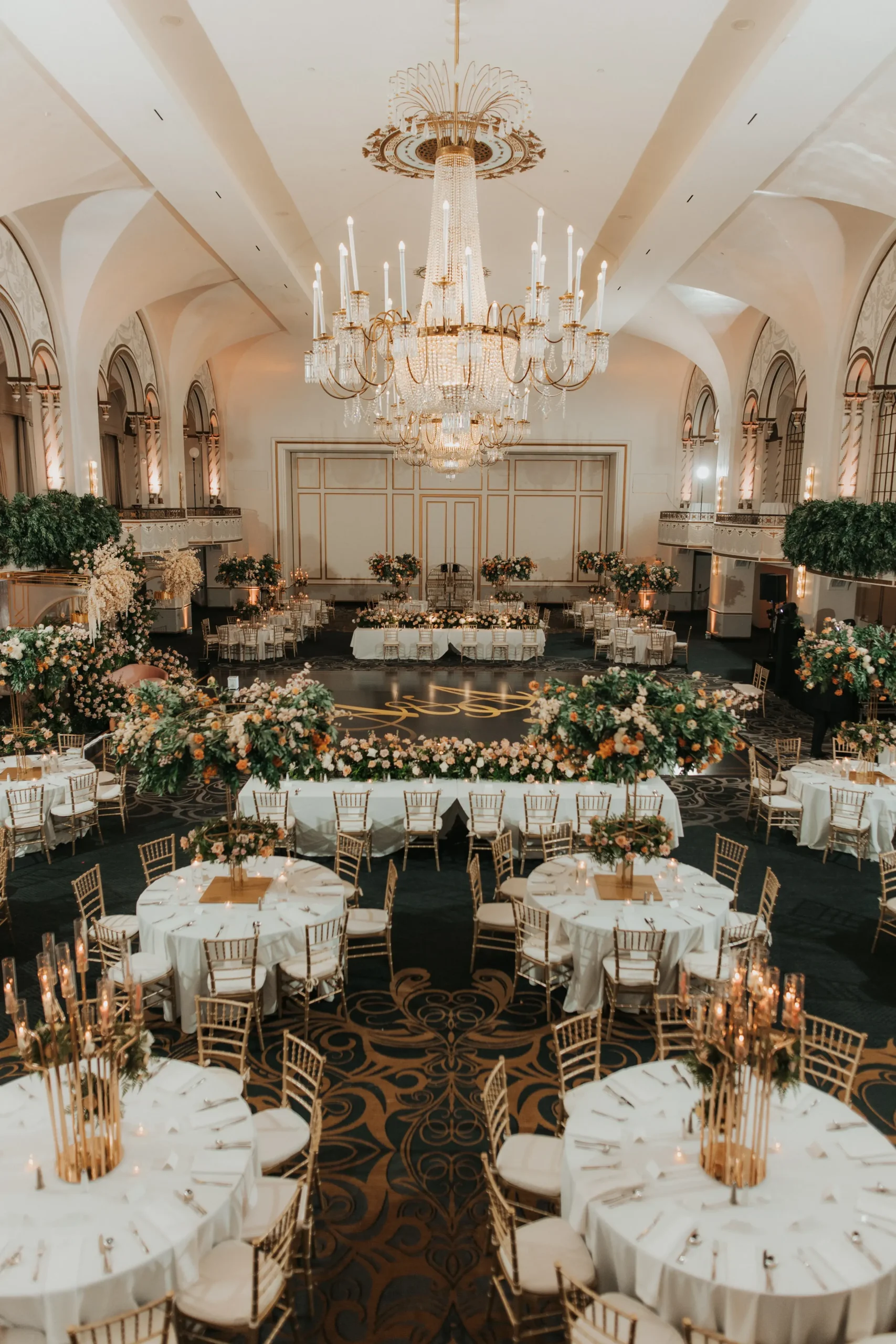 That evening the party resumed in the ballroom where their designer and planner had created an absolutely enchanting reception space filled with beautiful florals and lighting. Complete with a focal centerpiece where Akshayaa and Amar sat to hear from their friends and family as they offered toasts, dances, jokes, and music.