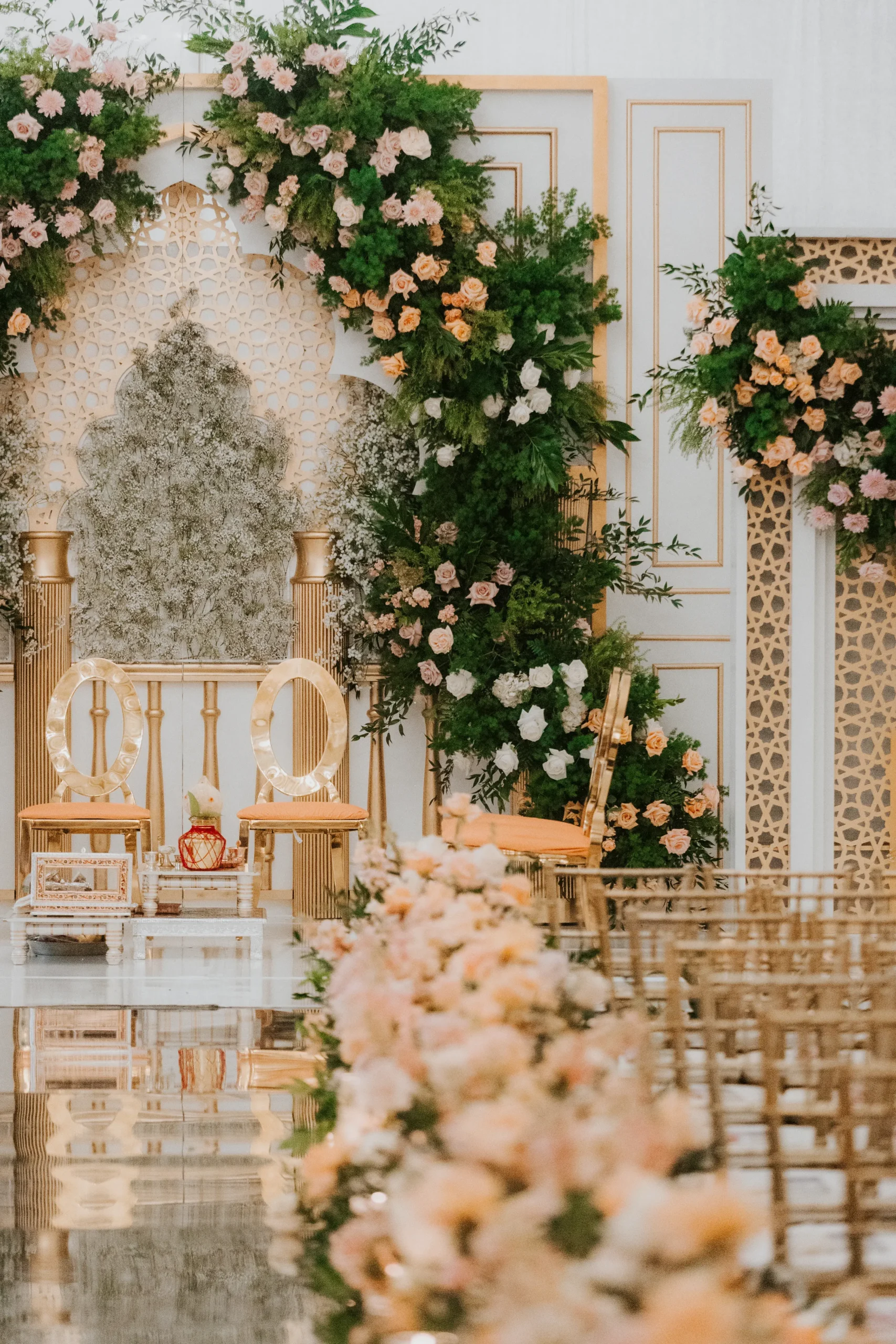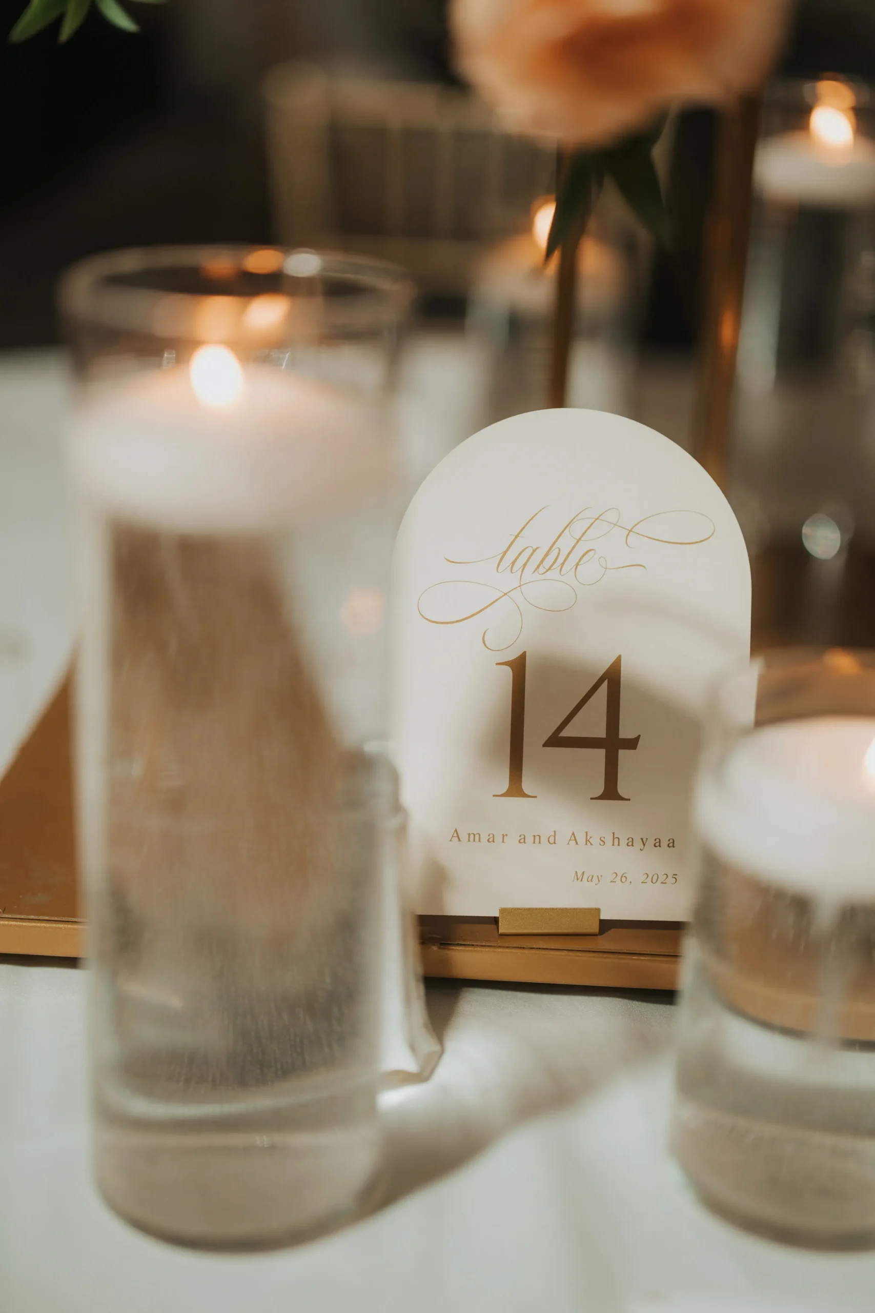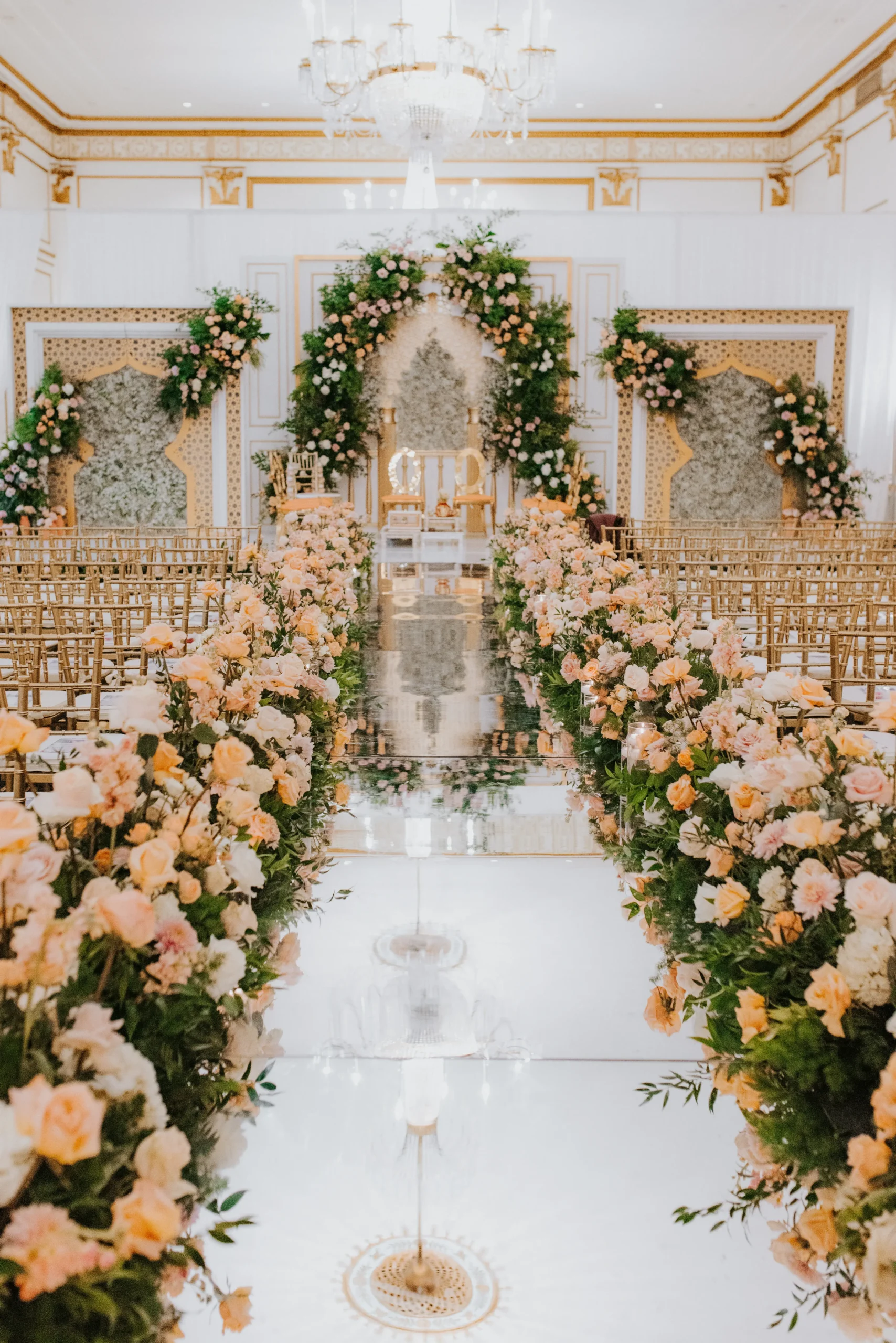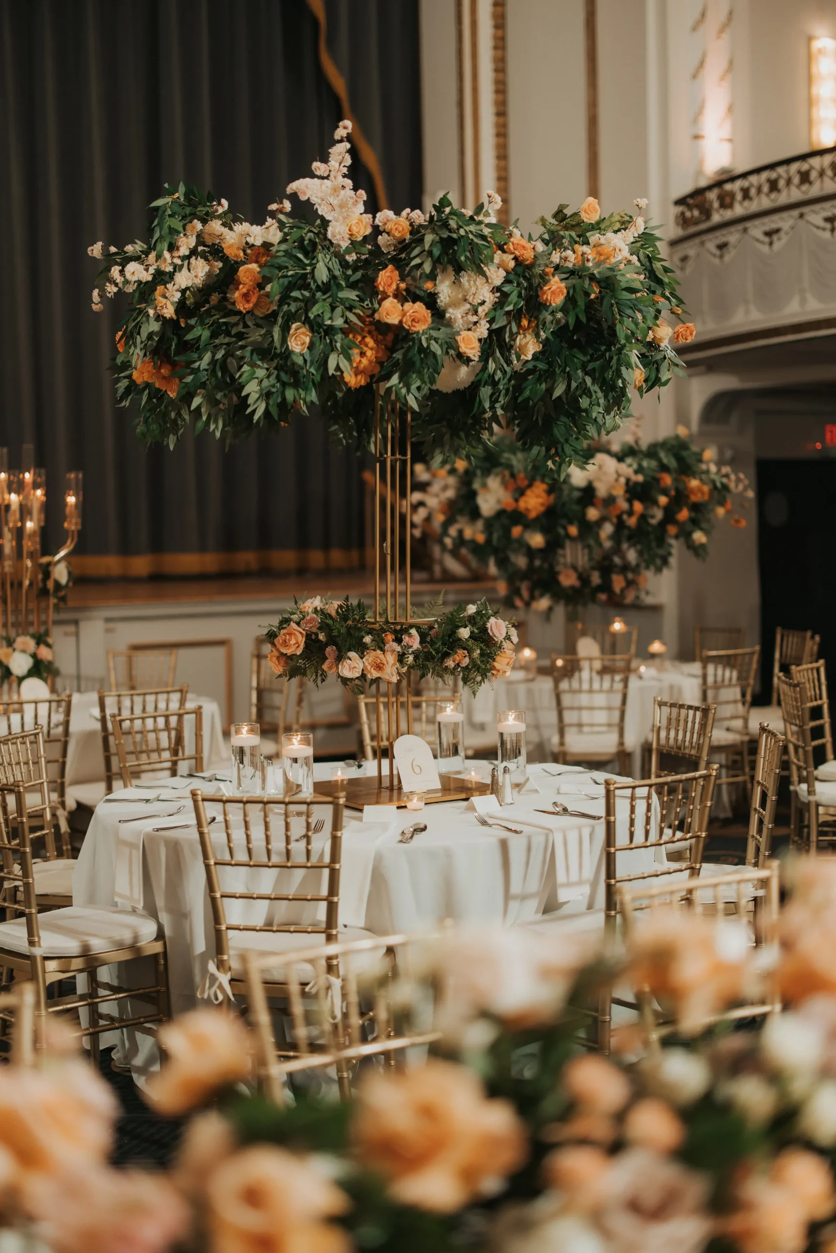 That evening the party resumed in the ballroom where their designer and planner had created an absolutely enchanting reception space filled with beautiful florals and lighting. Complete with a focal centerpiece where Akshayaa and Amar sat to hear from their friends and family as they offered toasts, dances, jokes, and music.