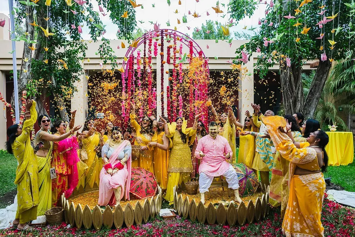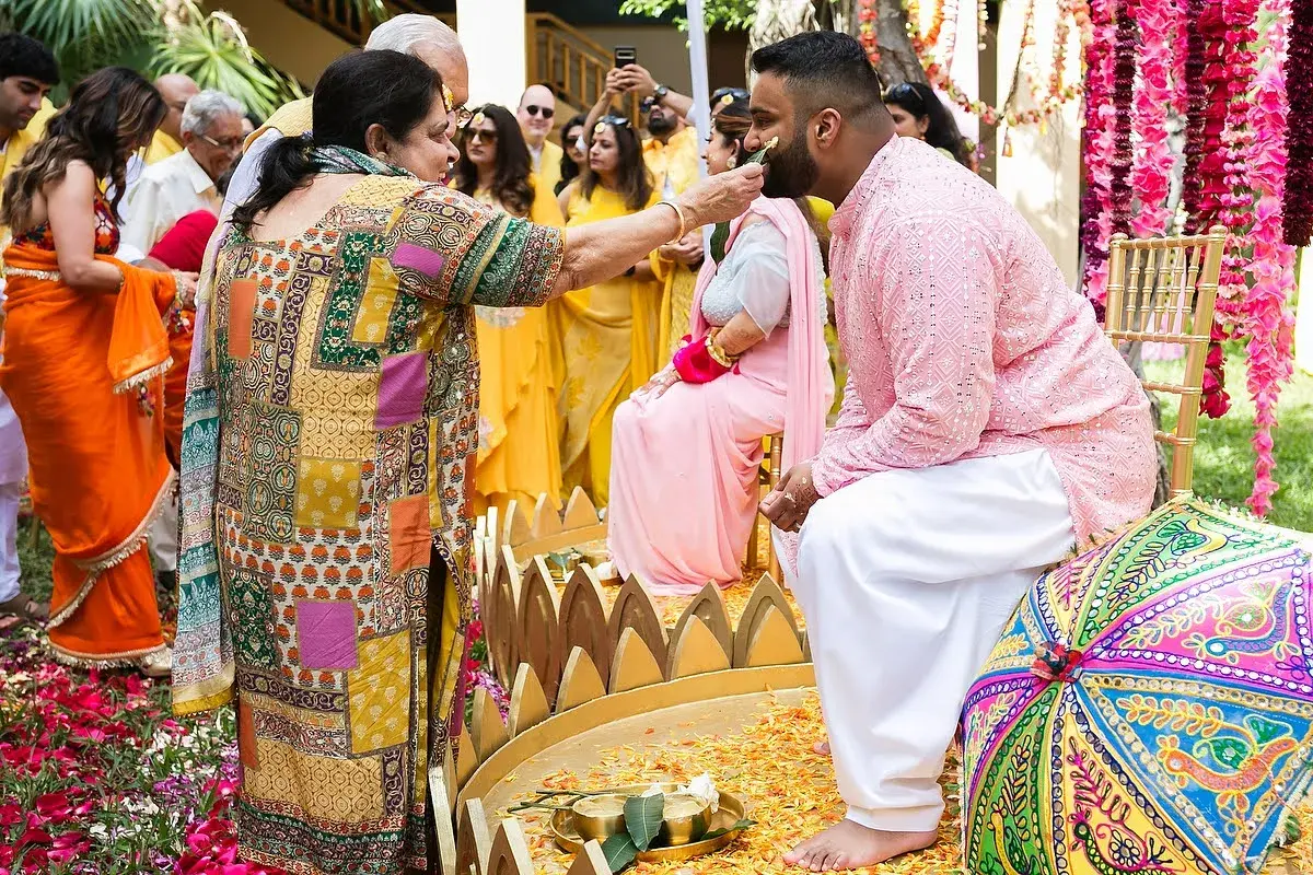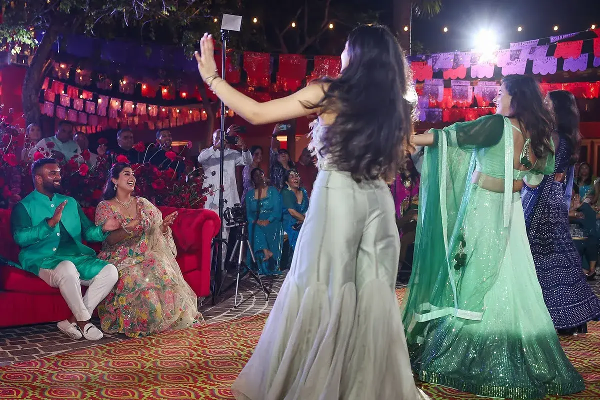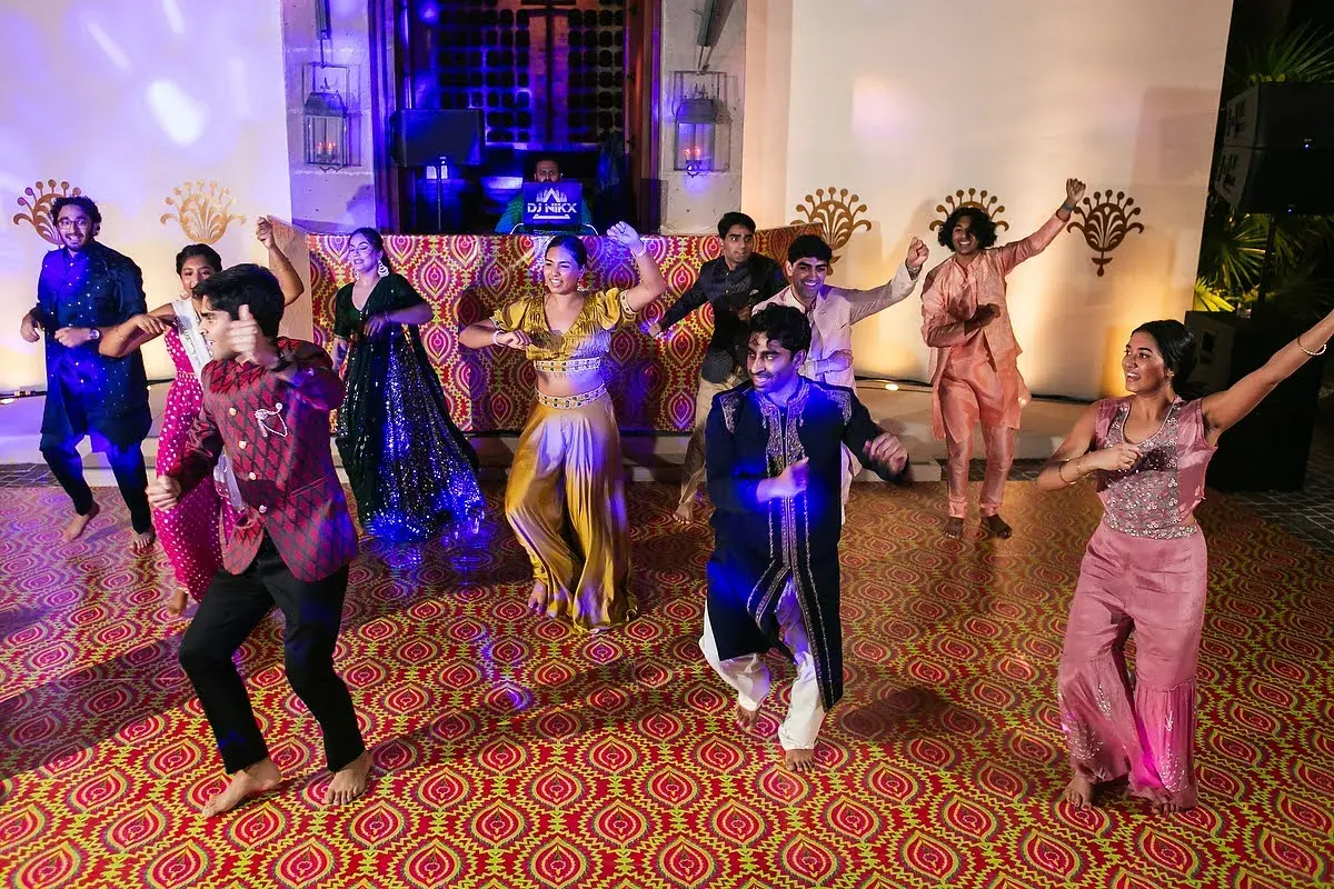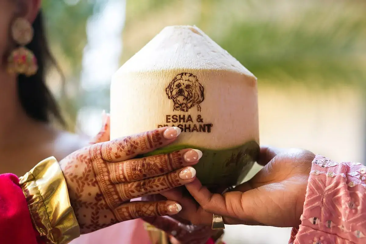 With the vision and guidance of planner Xanath Bañuelos, every detail was a balance of tradition, emotion, and modern flair. The festivities began with a beachside welcome dinner lit by fireworks and fire dancers, followed by a joyful pastel Haldi ceremony, coconuts stamped with their dog’s face, and a Mehendi-Sangeet bursting with color, dance, and handmade details.