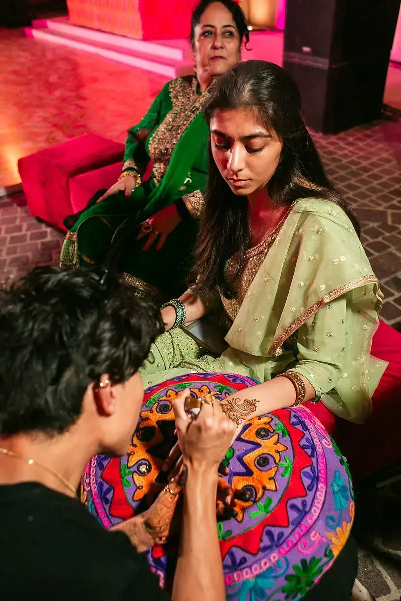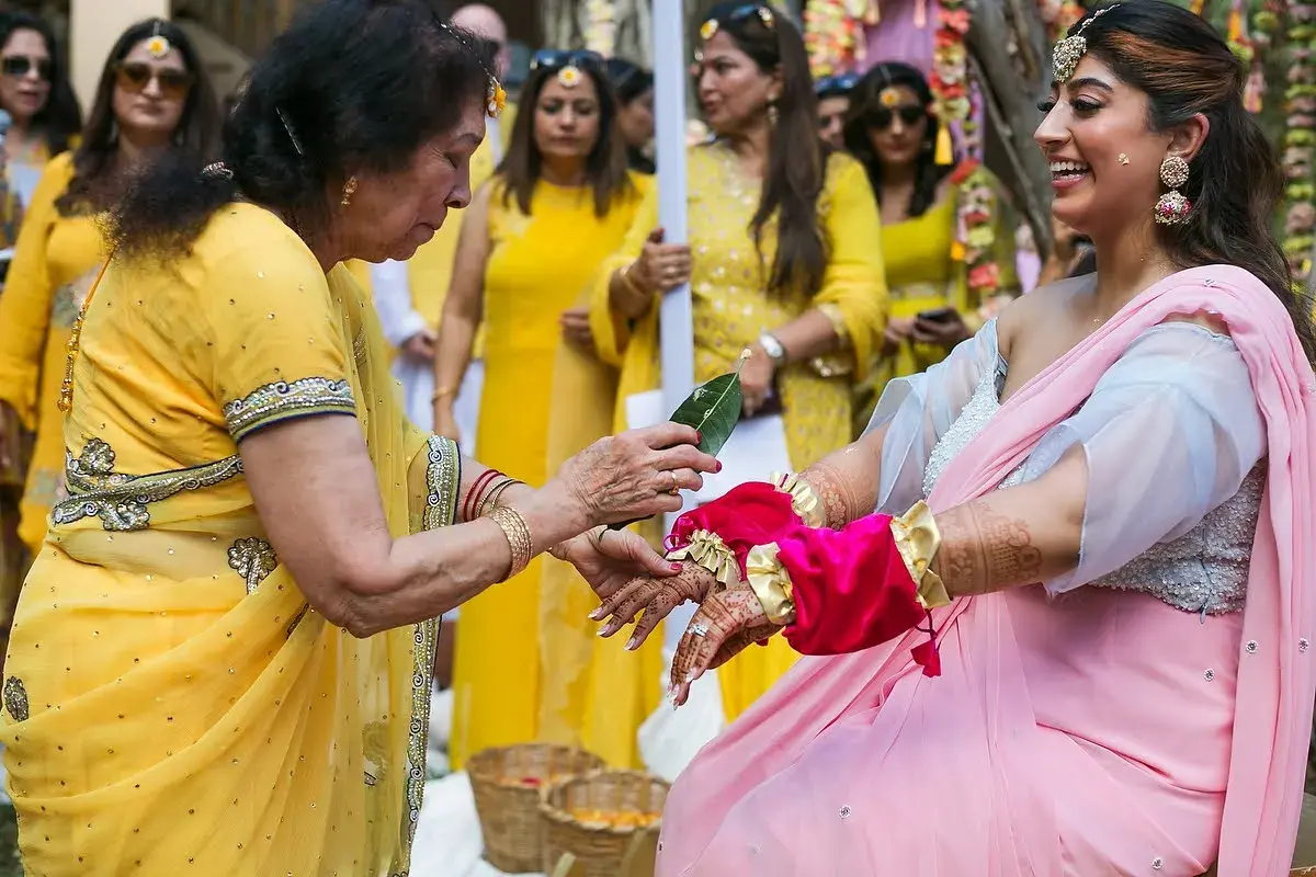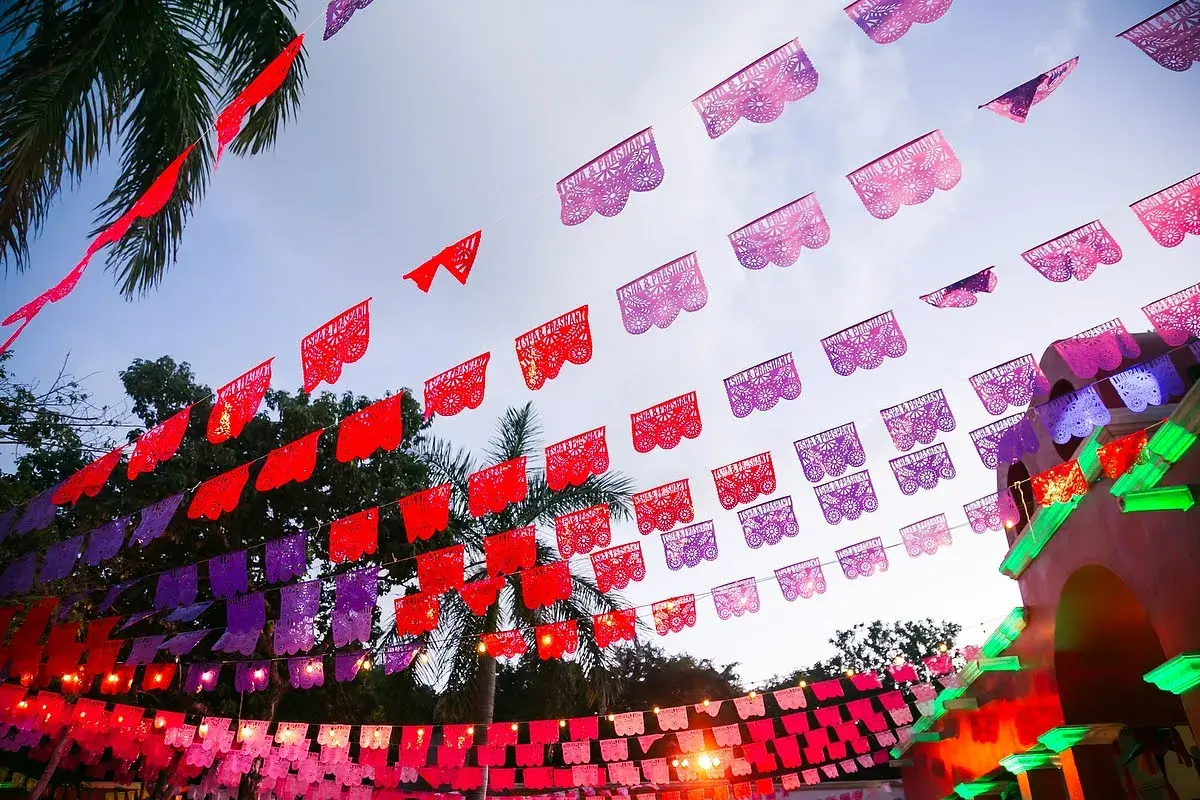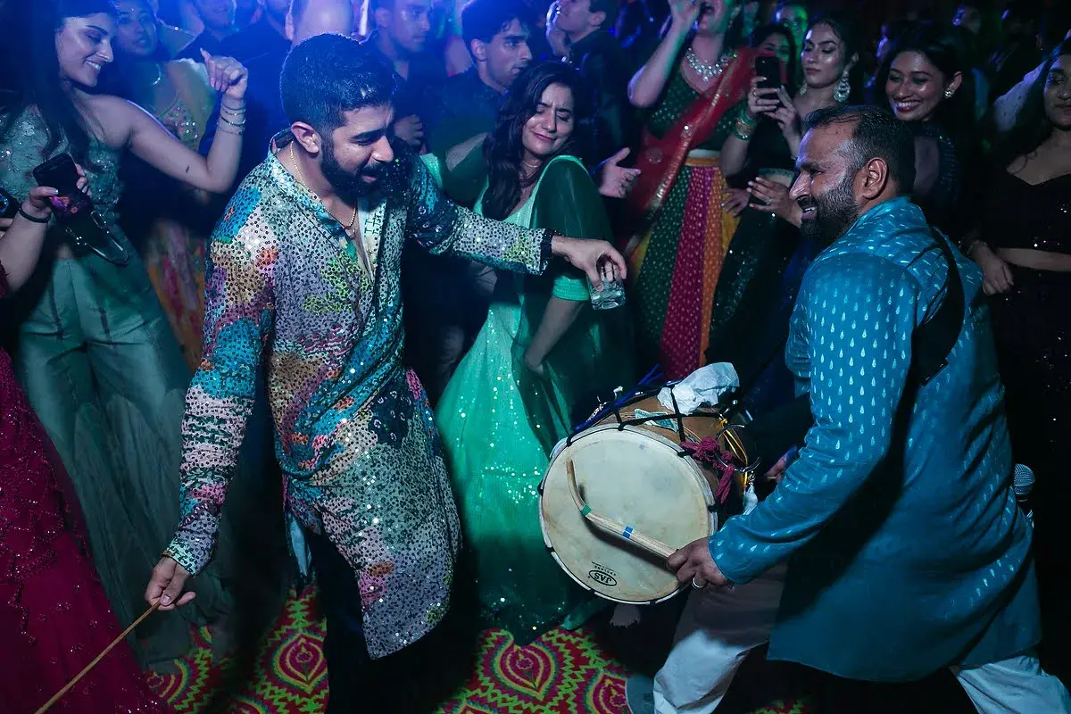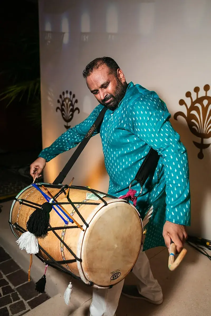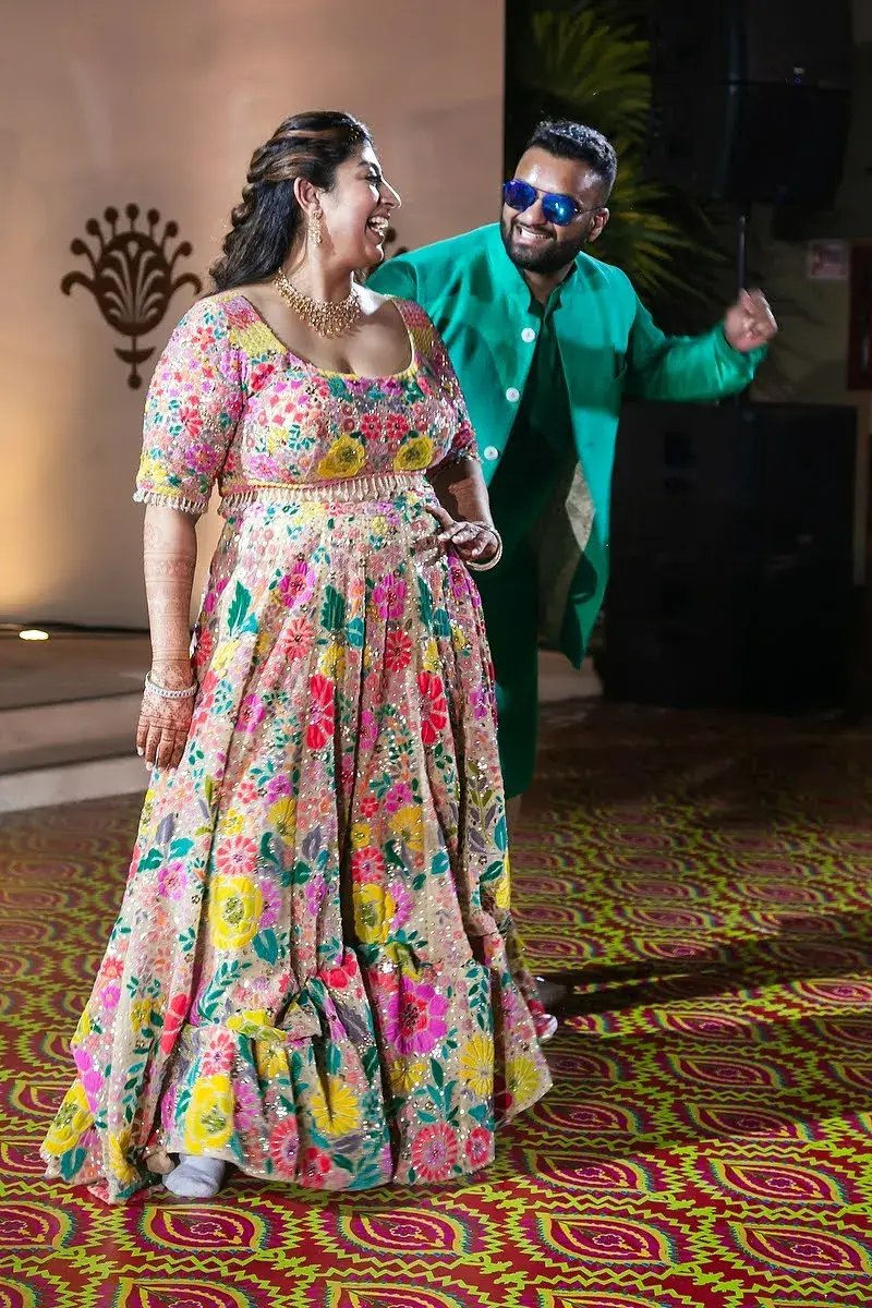 With the vision and guidance of planner Xanath Bañuelos, every detail was a balance of tradition, emotion, and modern flair. The festivities began with a beachside welcome dinner lit by fireworks and fire dancers, followed by a joyful pastel Haldi ceremony, coconuts stamped with their dog’s face, and a Mehendi-Sangeet bursting with color, dance, and handmade details.