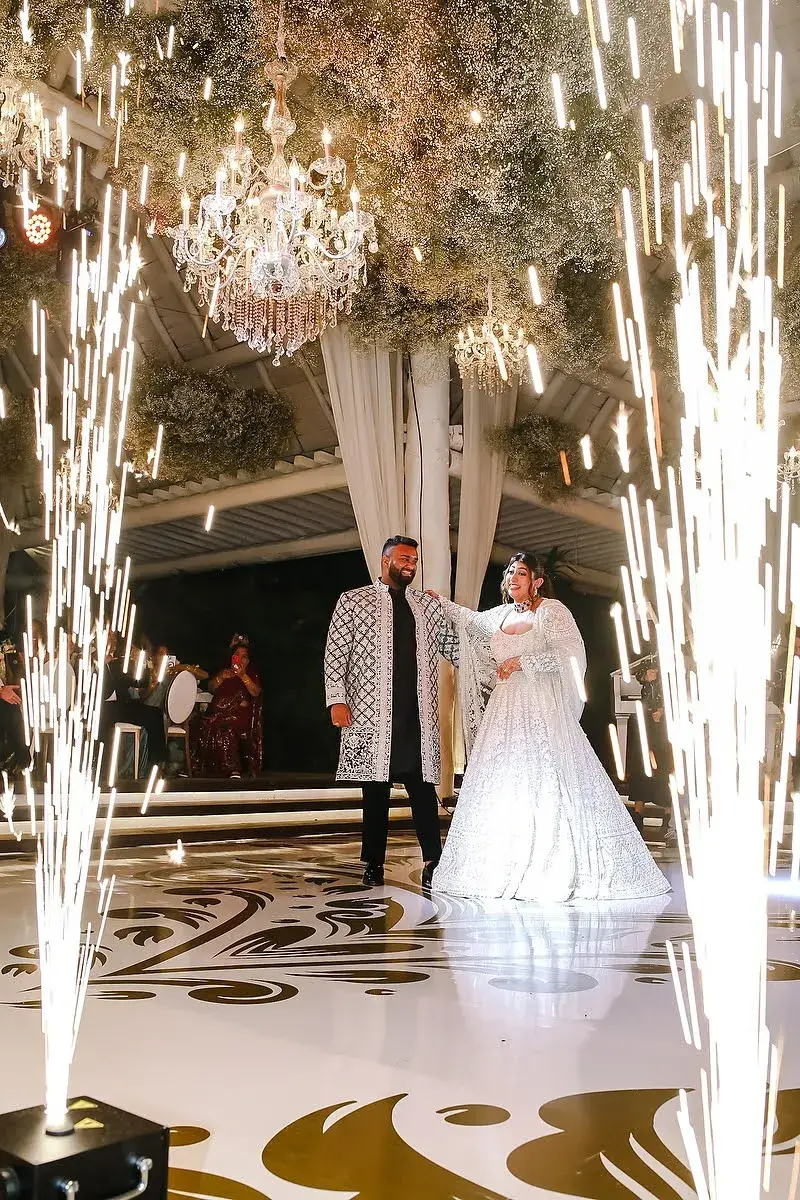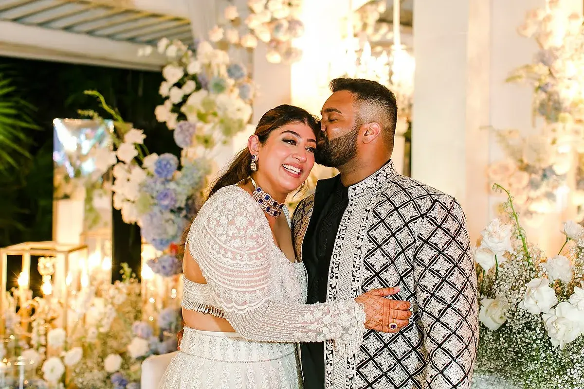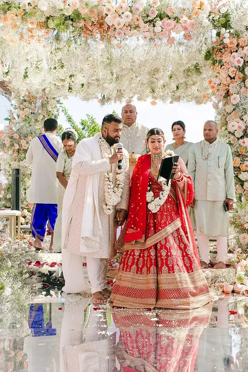 The wedding ceremony felt like a dream—soft florals, a mirrored aisle reflecting the sea, and heartfelt traditions shared over banana leaf meals. Esha stunned in Sabyasachi while Prashant wore Diwan Saheb. Their reception dazzled with aerialists, a chamber orchestra, and a regal Manish Malhotra look for both bride and groom.