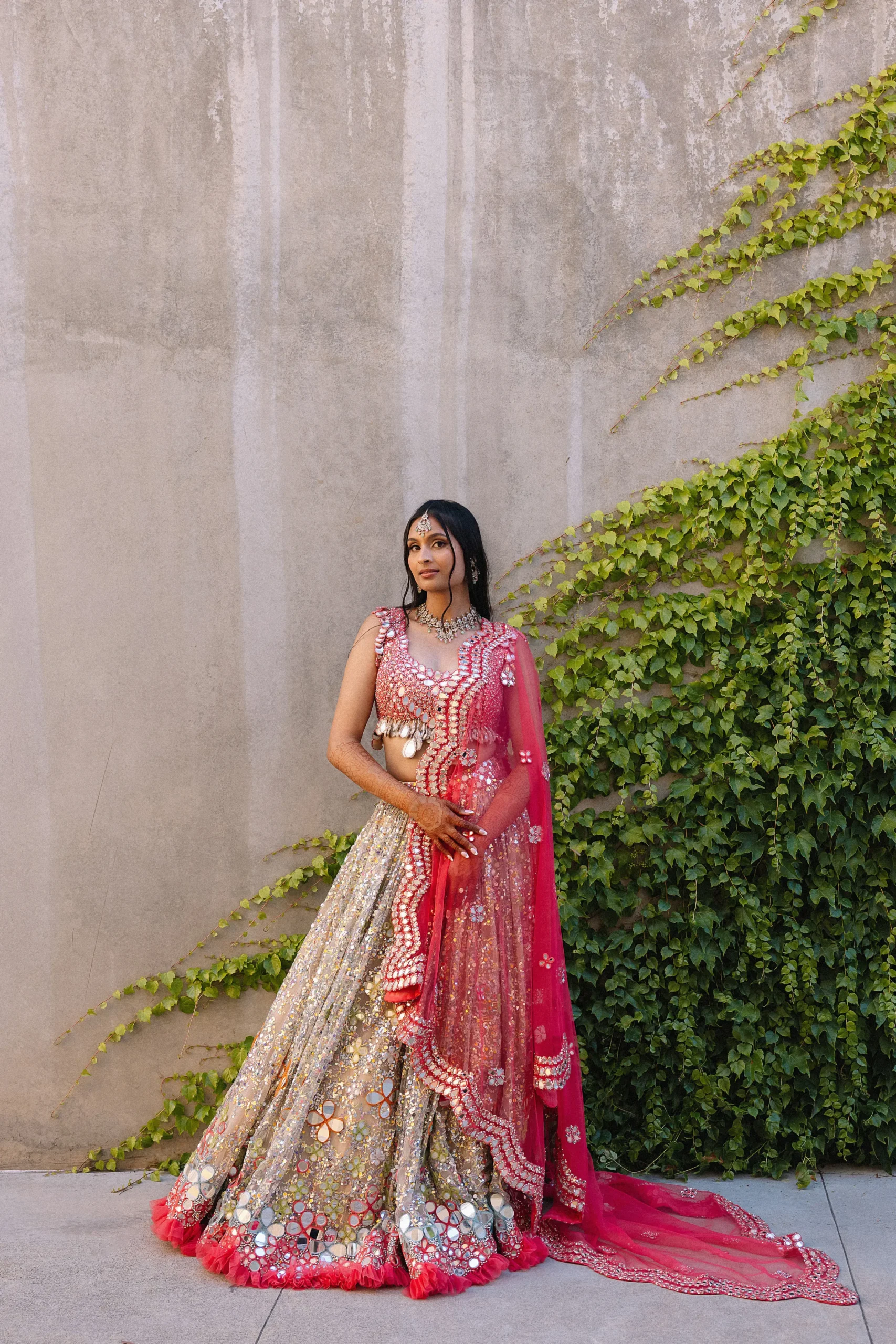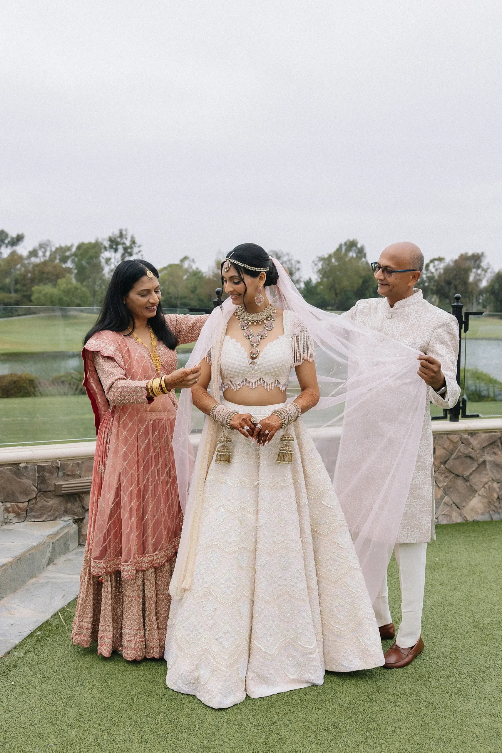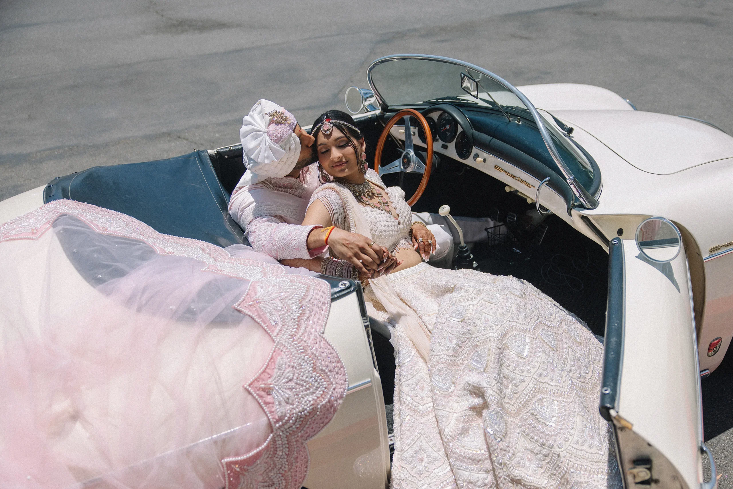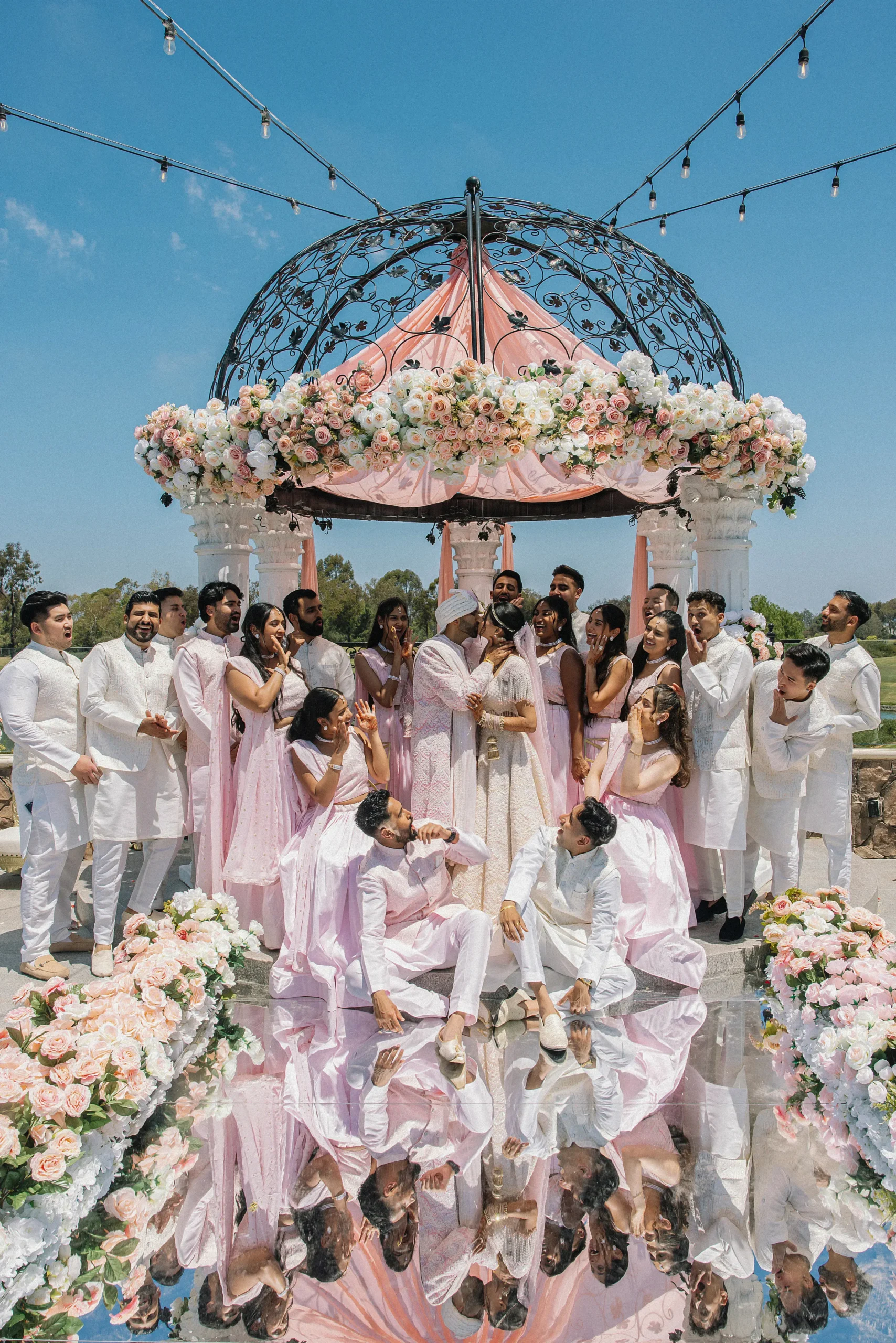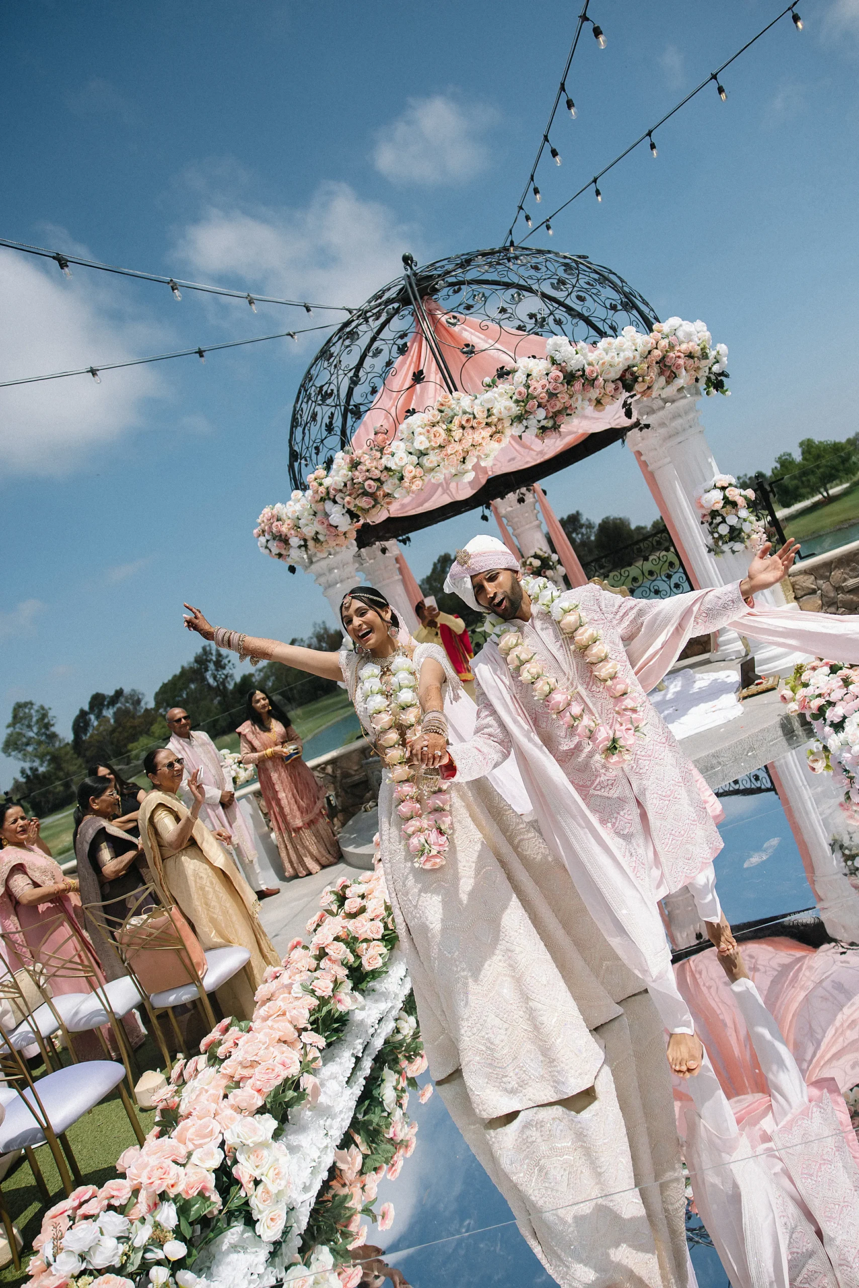 On June 14, already their anniversary and proposal date, they wed surrounded by family and friends. Himani surprised Jay with life-size polaroids of every June 14 they had shared, carried down the aisle by his groomsmen. For the ceremony, she wore a pearl-encrusted white lehenga with a delicate veil, clean, elegant, and refreshingly different from the heavy red looks of most brides. Their vows emphasized equality: they split the pheras evenly and rejected customs like Kanyadaan, choosing instead to symbolize marriage as expanding family, not leaving one.