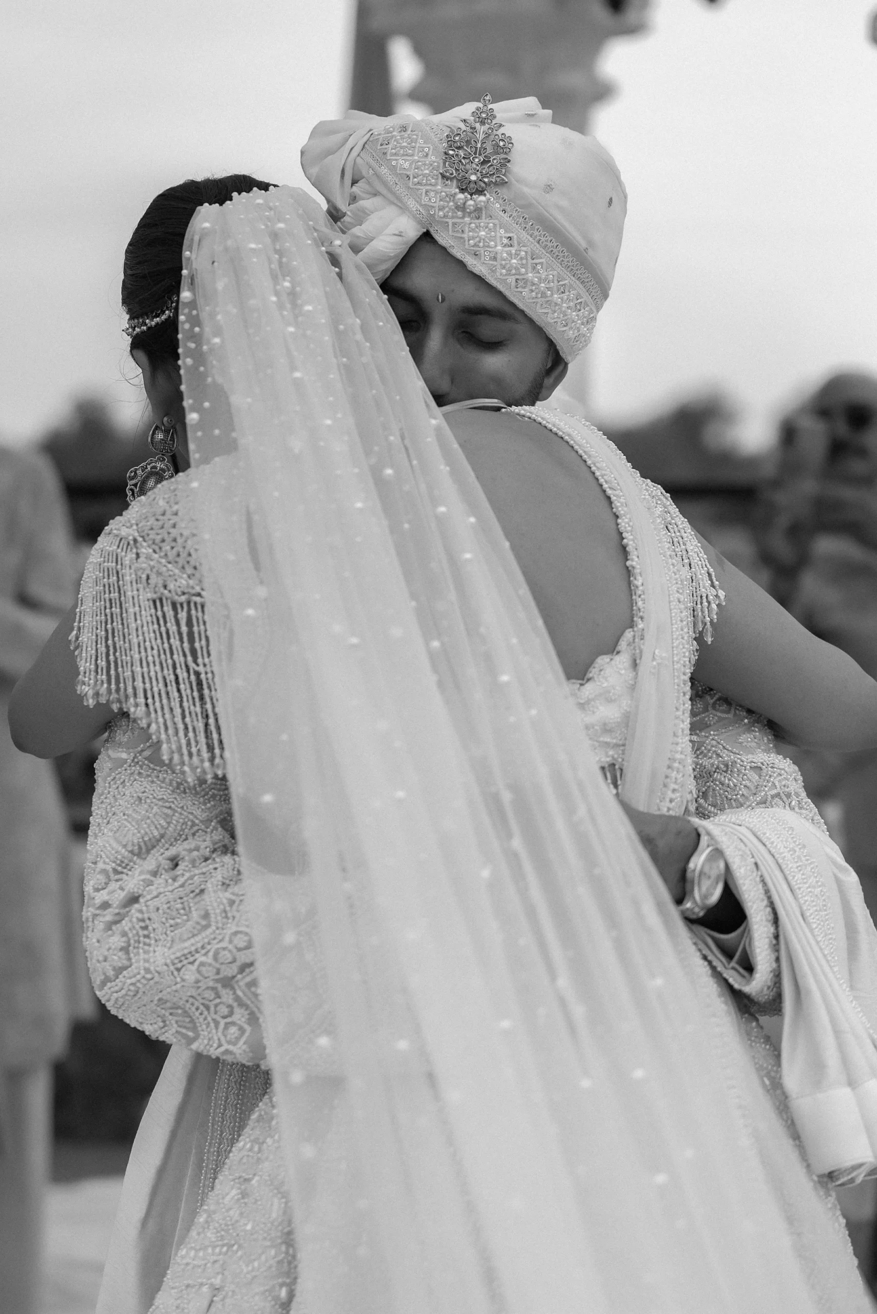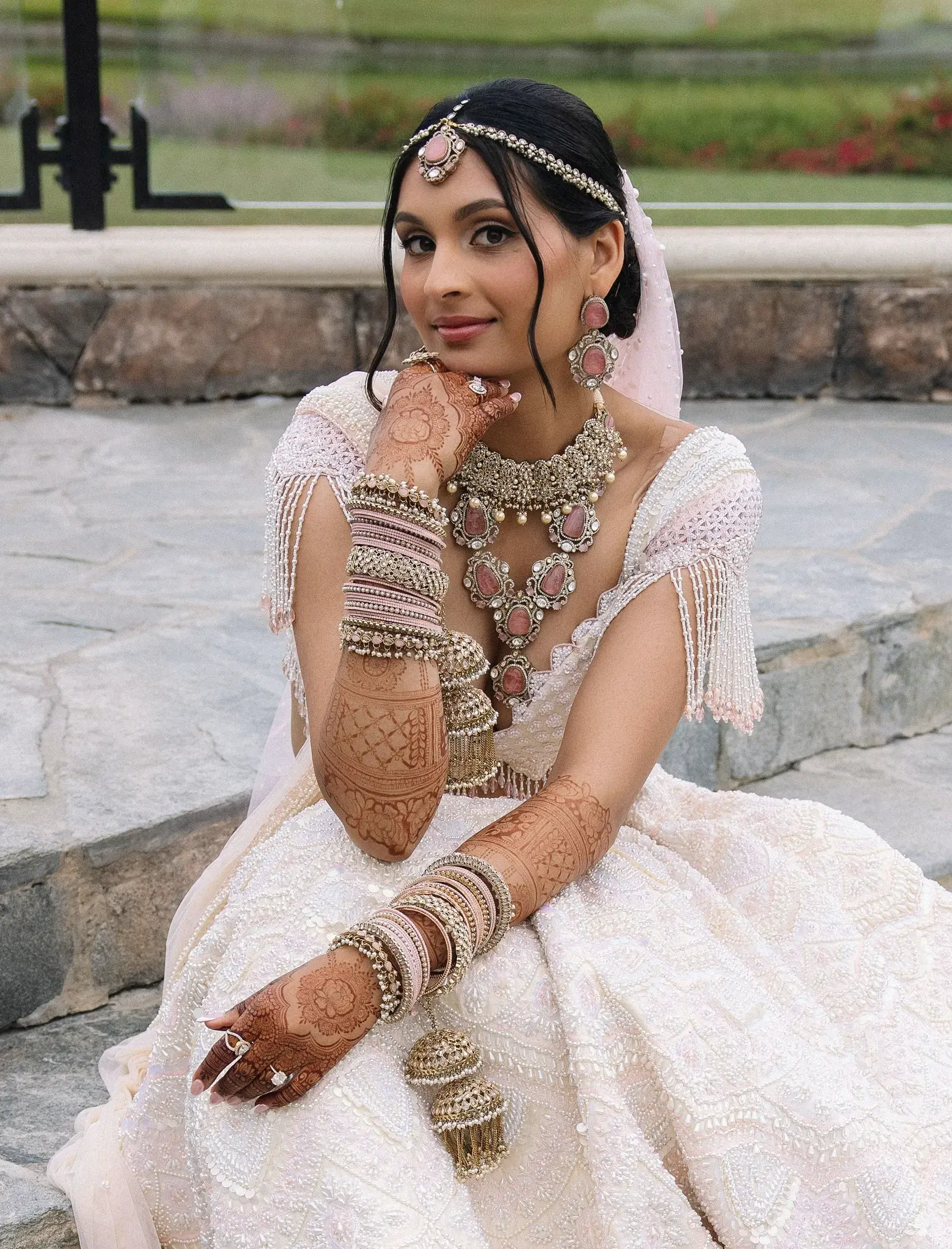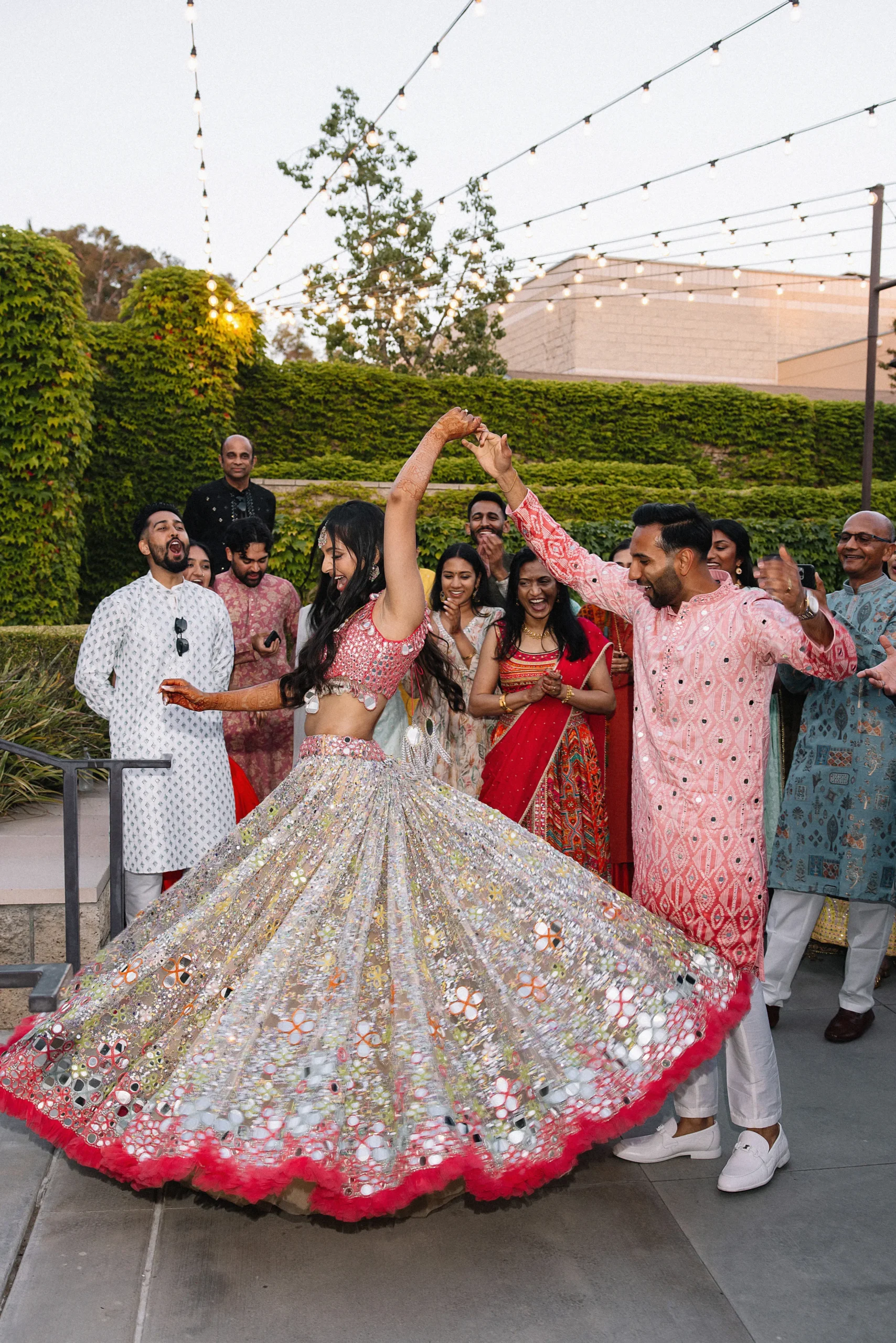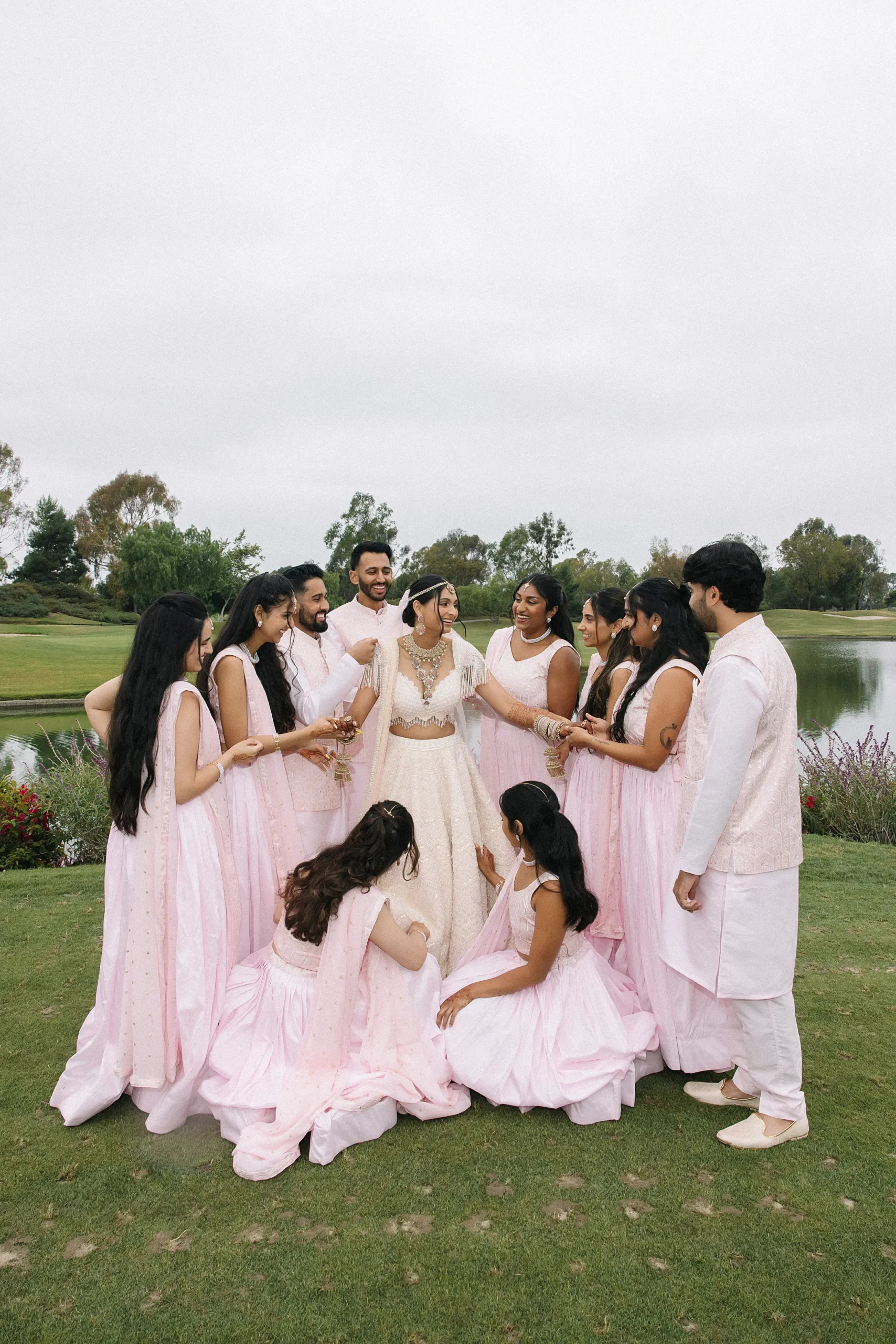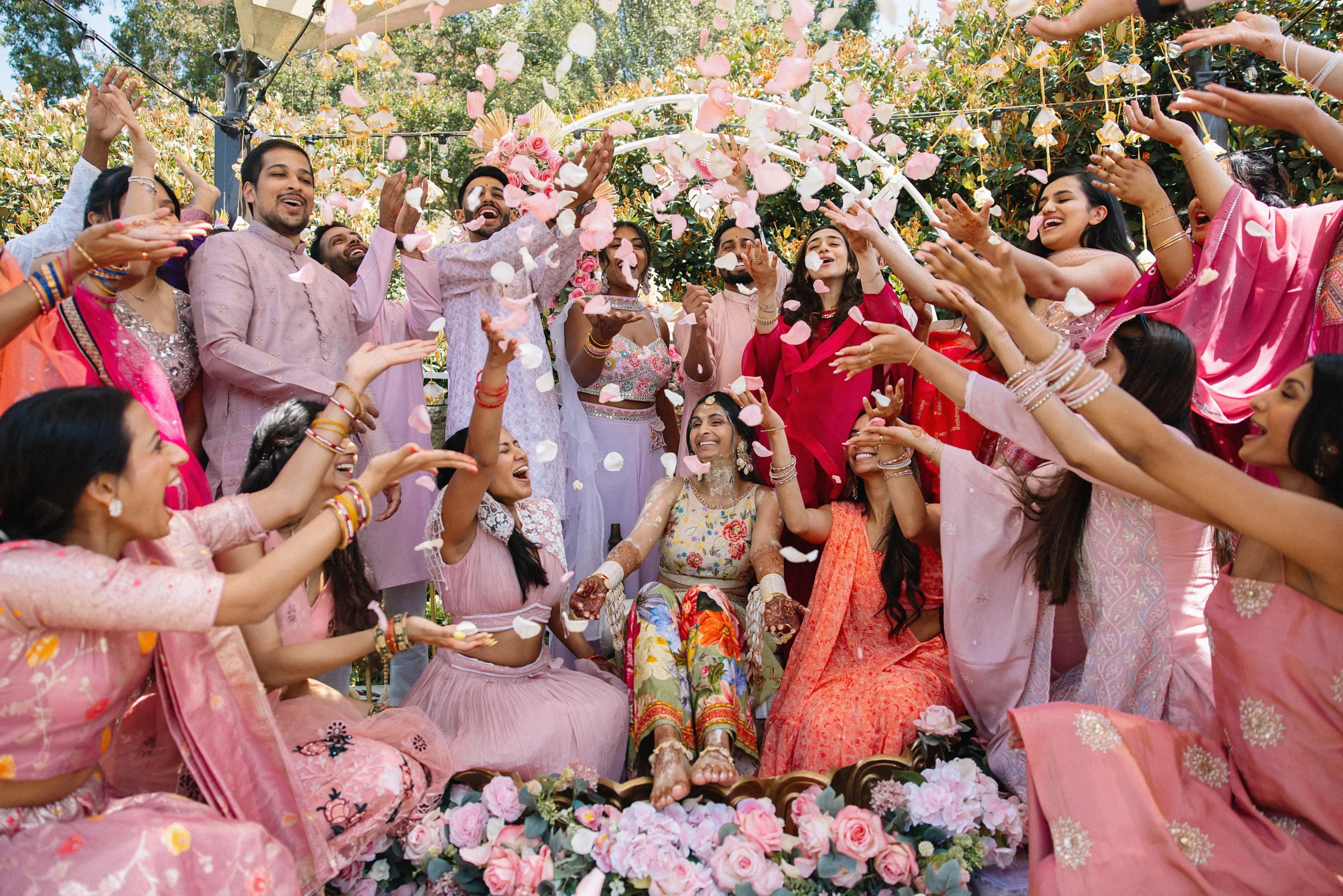 On June 14, already their anniversary and proposal date, they wed surrounded by family and friends. Himani surprised Jay with life-size polaroids of every June 14 they had shared, carried down the aisle by his groomsmen. For the ceremony, she wore a pearl-encrusted white lehenga with a delicate veil, clean, elegant, and refreshingly different from the heavy red looks of most brides. Their vows emphasized equality: they split the pheras evenly and rejected customs like Kanyadaan, choosing instead to symbolize marriage as expanding family, not leaving one.