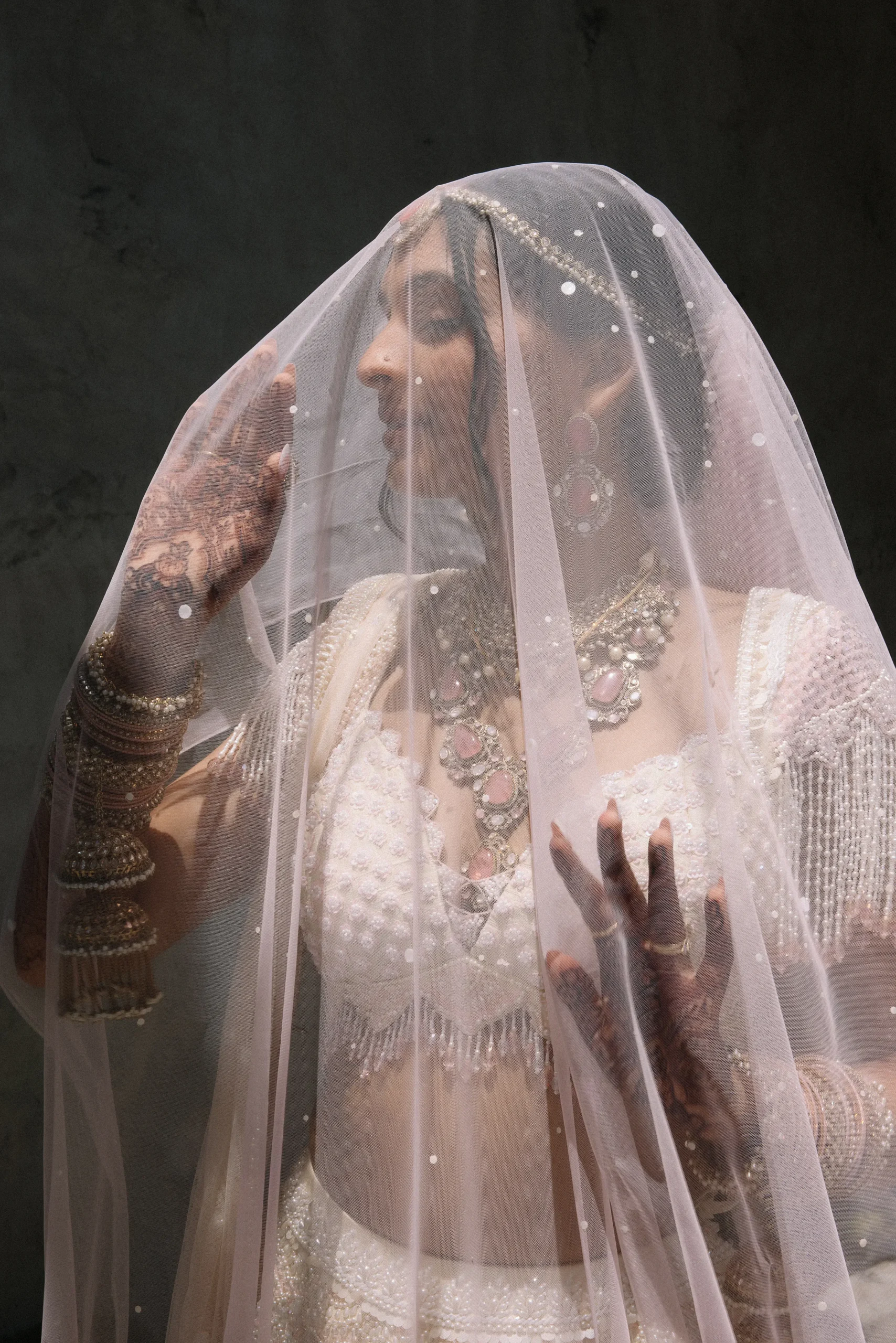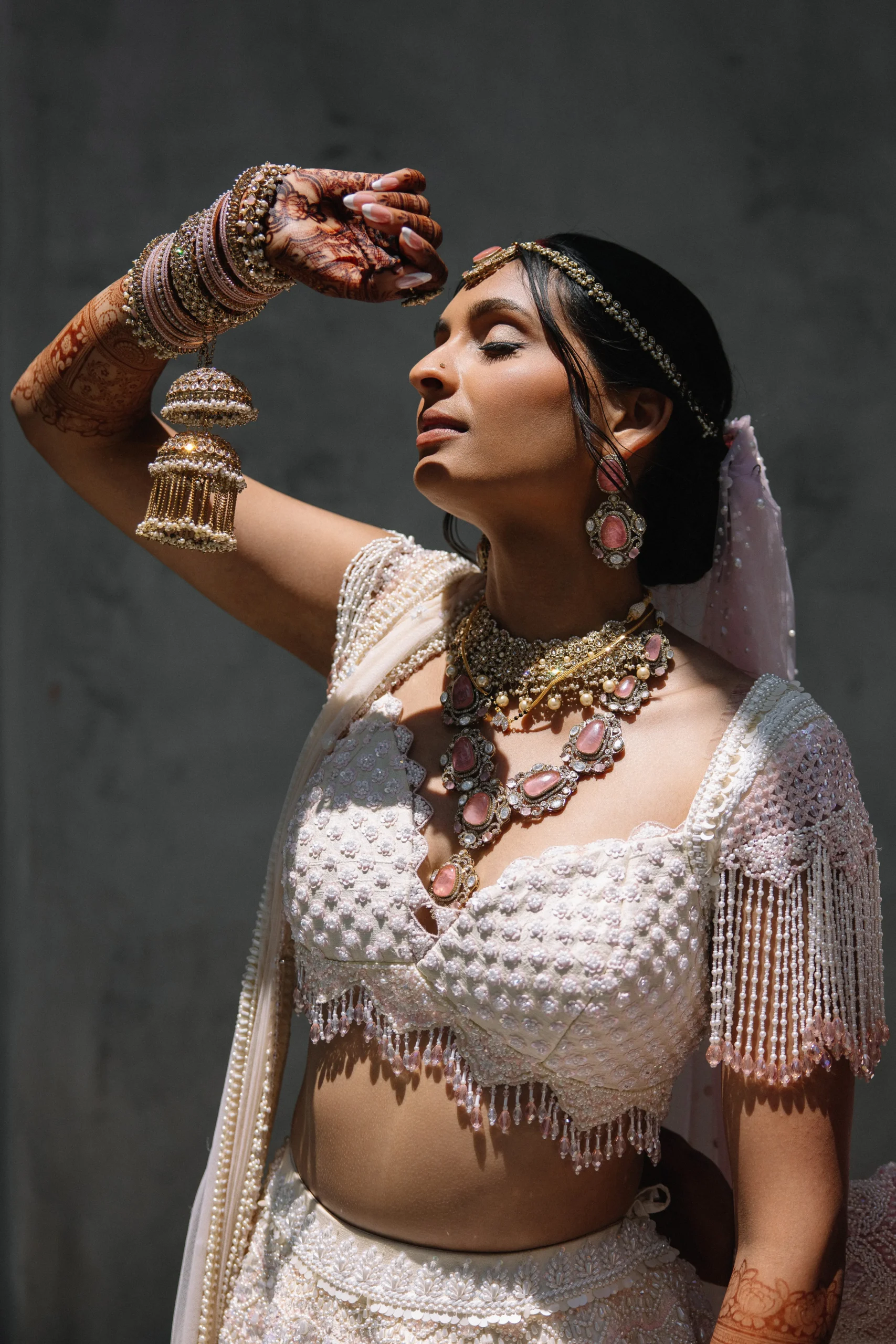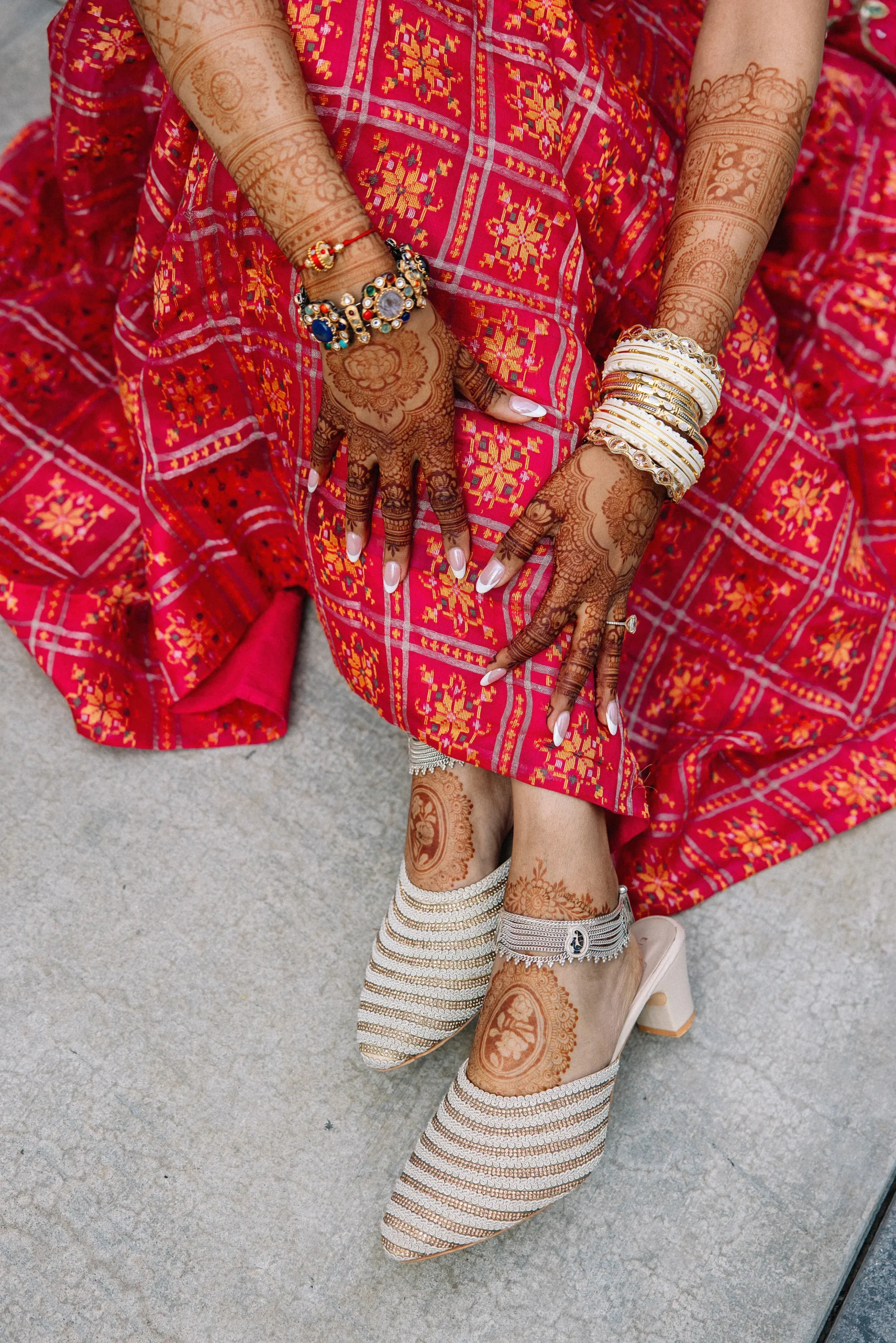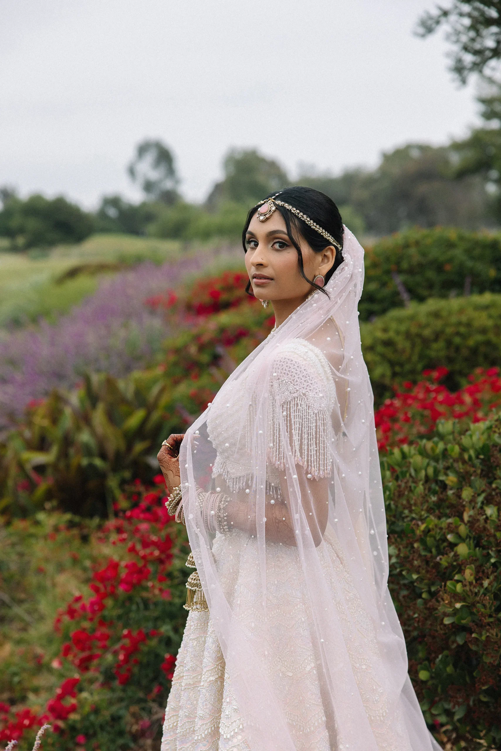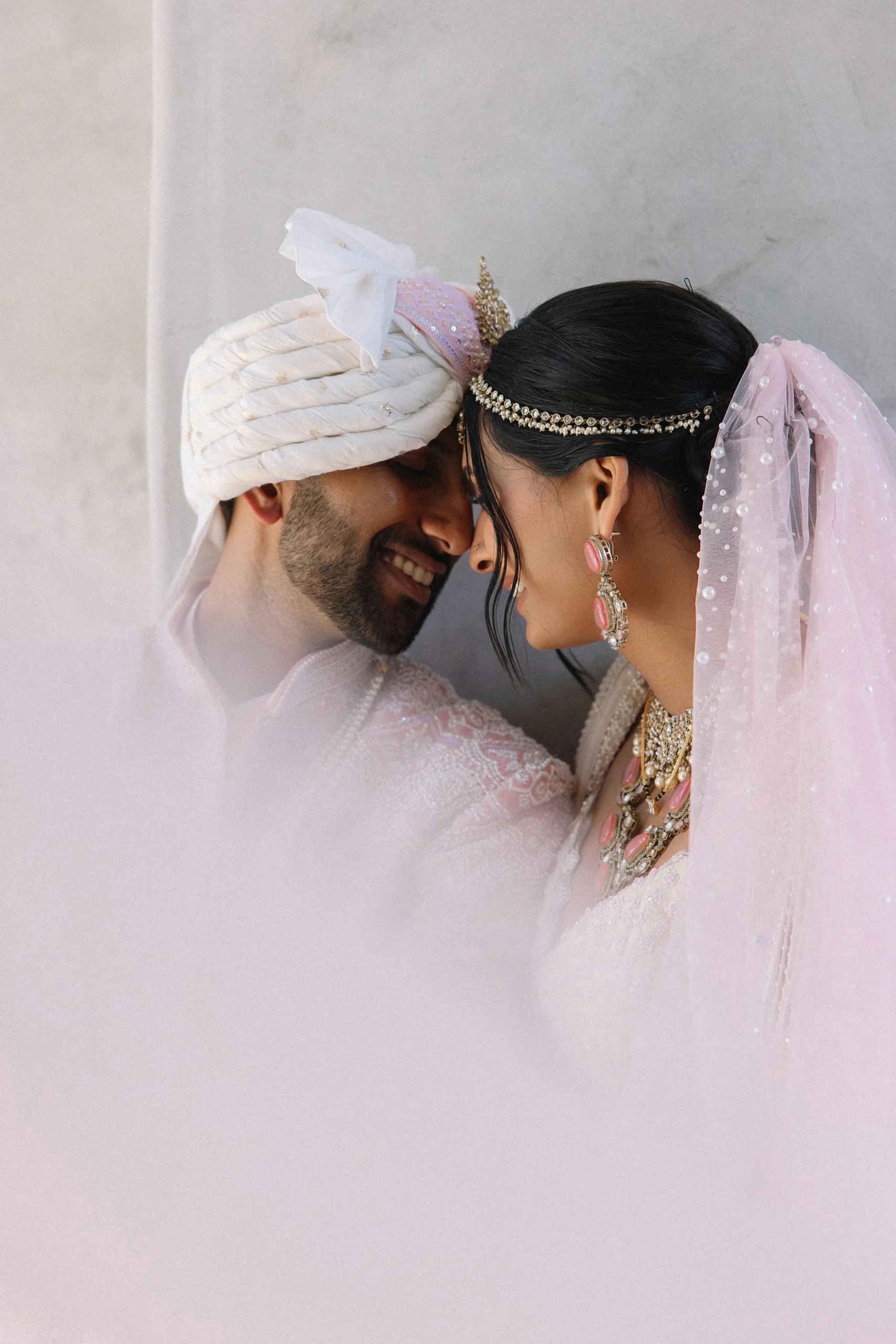 On June 14, already their anniversary and proposal date, they wed surrounded by family and friends. Himani surprised Jay with life-size polaroids of every June 14 they had shared, carried down the aisle by his groomsmen. For the ceremony, she wore a pearl-encrusted white lehenga with a delicate veil, clean, elegant, and refreshingly different from the heavy red looks of most brides. Their vows emphasized equality: they split the pheras evenly and rejected customs like Kanyadaan, choosing instead to symbolize marriage as expanding family, not leaving one.