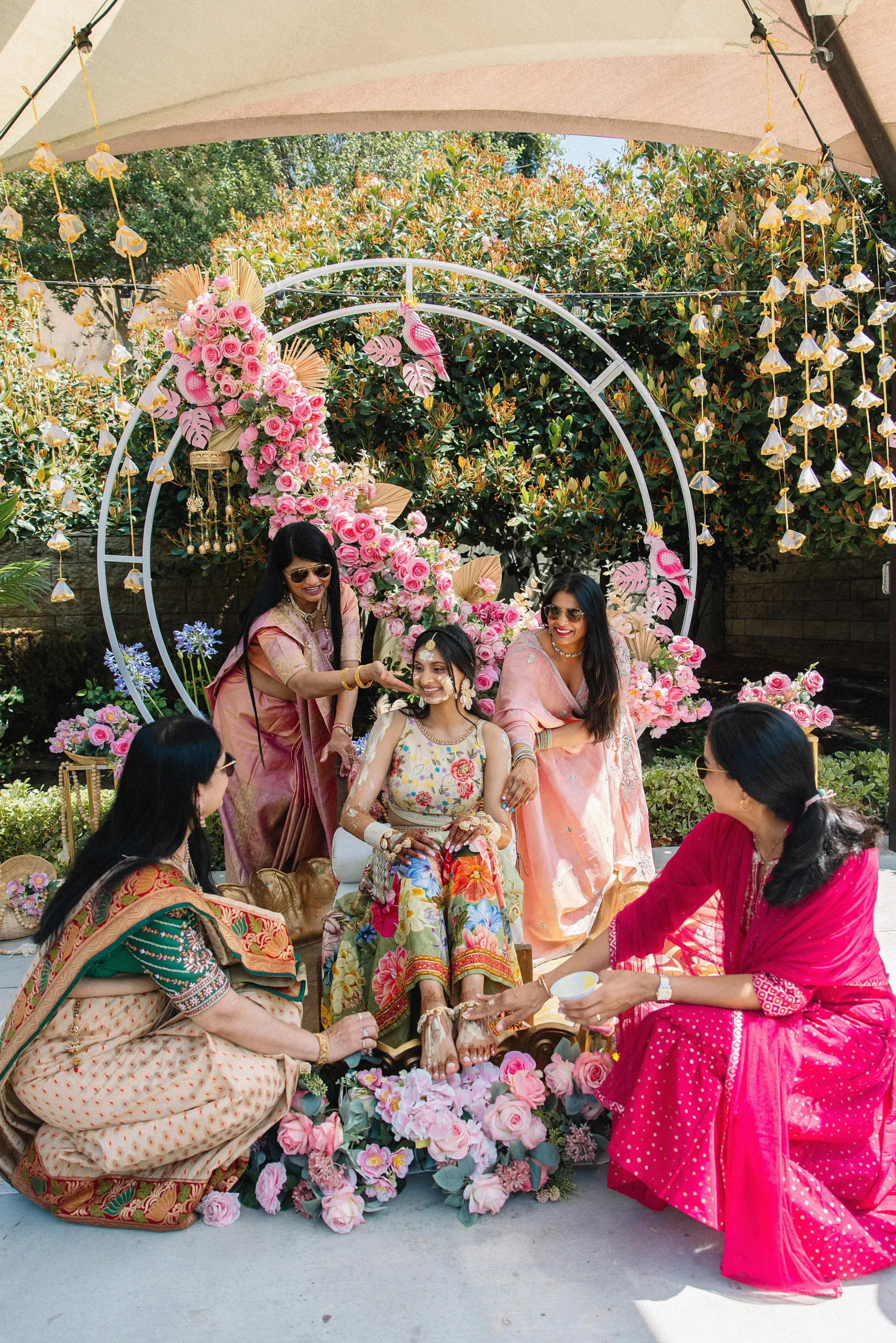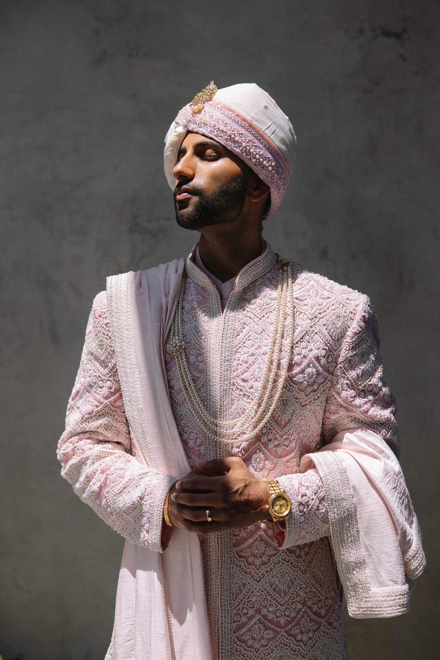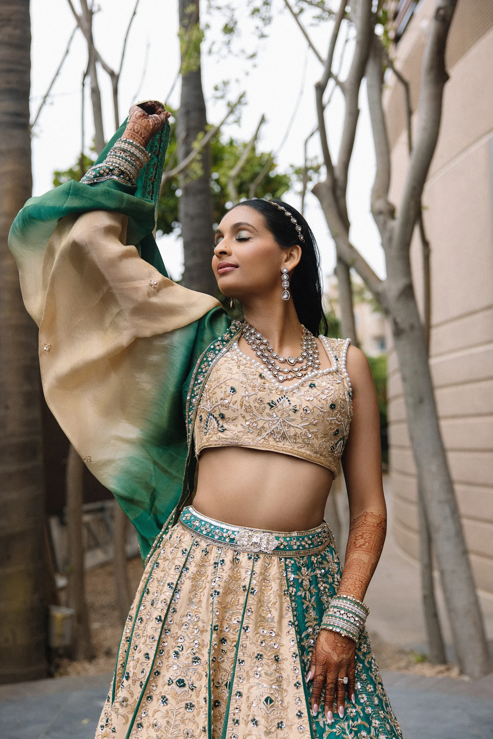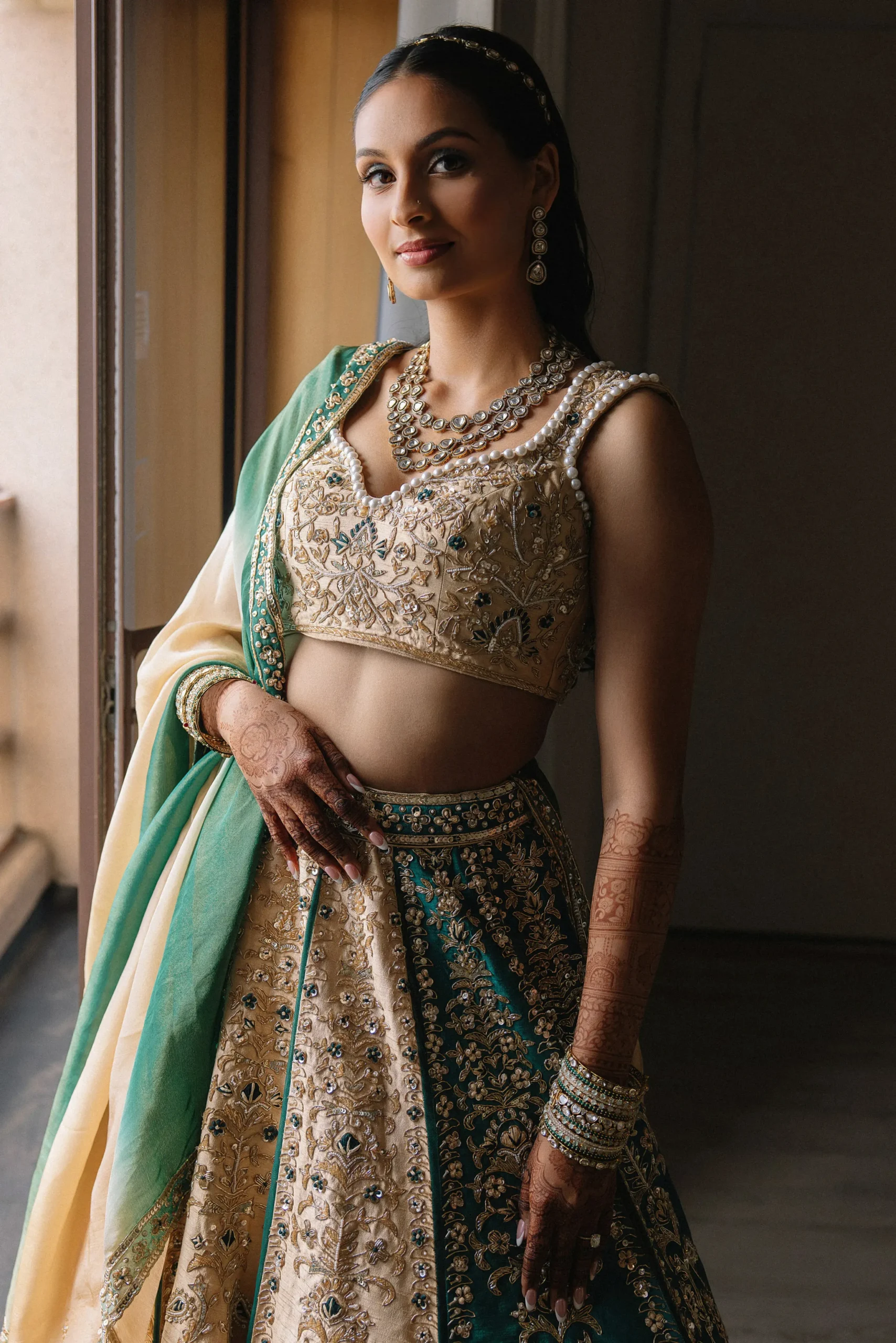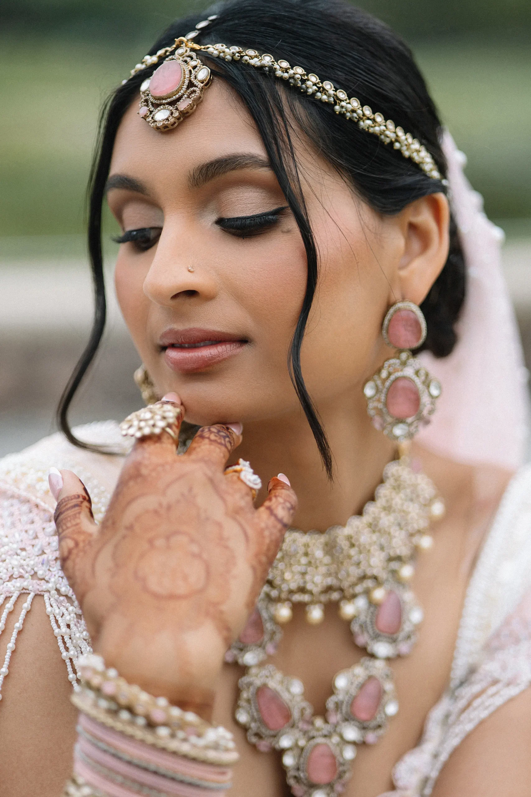 On June 14, already their anniversary and proposal date, they wed surrounded by family and friends. Himani surprised Jay with life-size polaroids of every June 14 they had shared, carried down the aisle by his groomsmen. For the ceremony, she wore a pearl-encrusted white lehenga with a delicate veil, clean, elegant, and refreshingly different from the heavy red looks of most brides. Their vows emphasized equality: they split the pheras evenly and rejected customs like Kanyadaan, choosing instead to symbolize marriage as expanding family, not leaving one.
