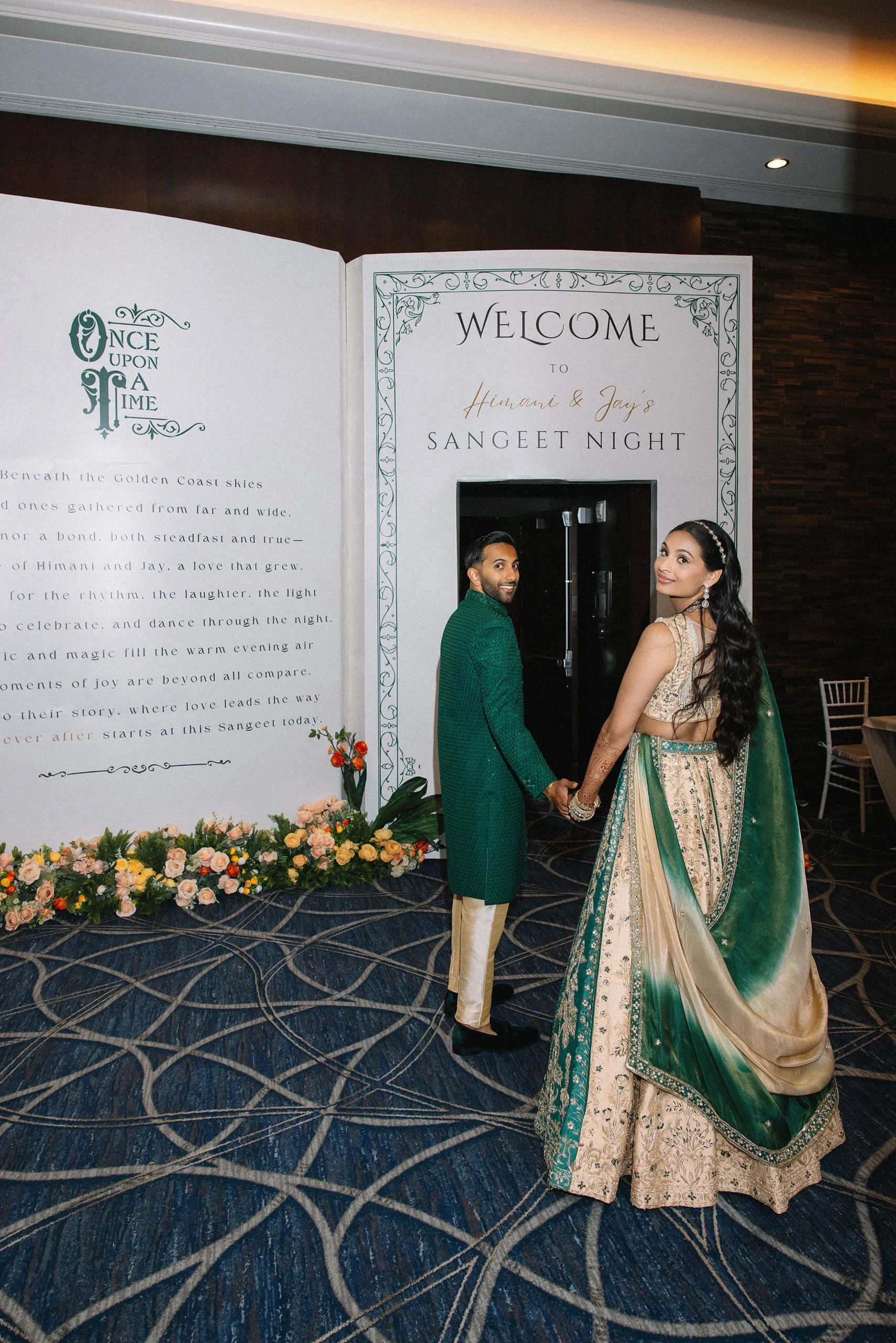 When planning their wedding, Himani and Jay chose storytelling as the heart of their theme. Their “Storybook Sangeet” invited guests to walk through a giant book, read original poems, and flip through the couple’s scrapbooks, each one a chapter of their journey.