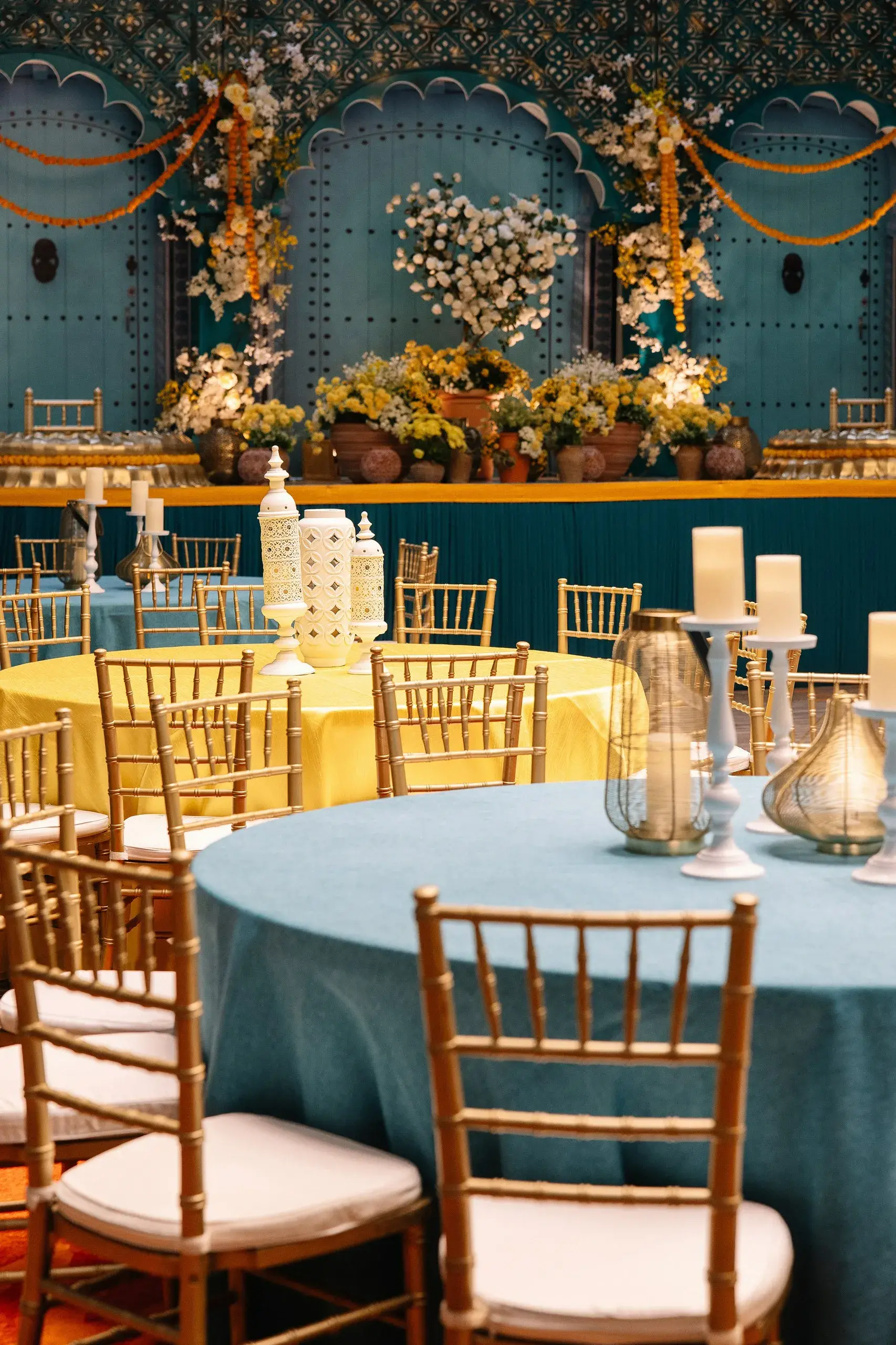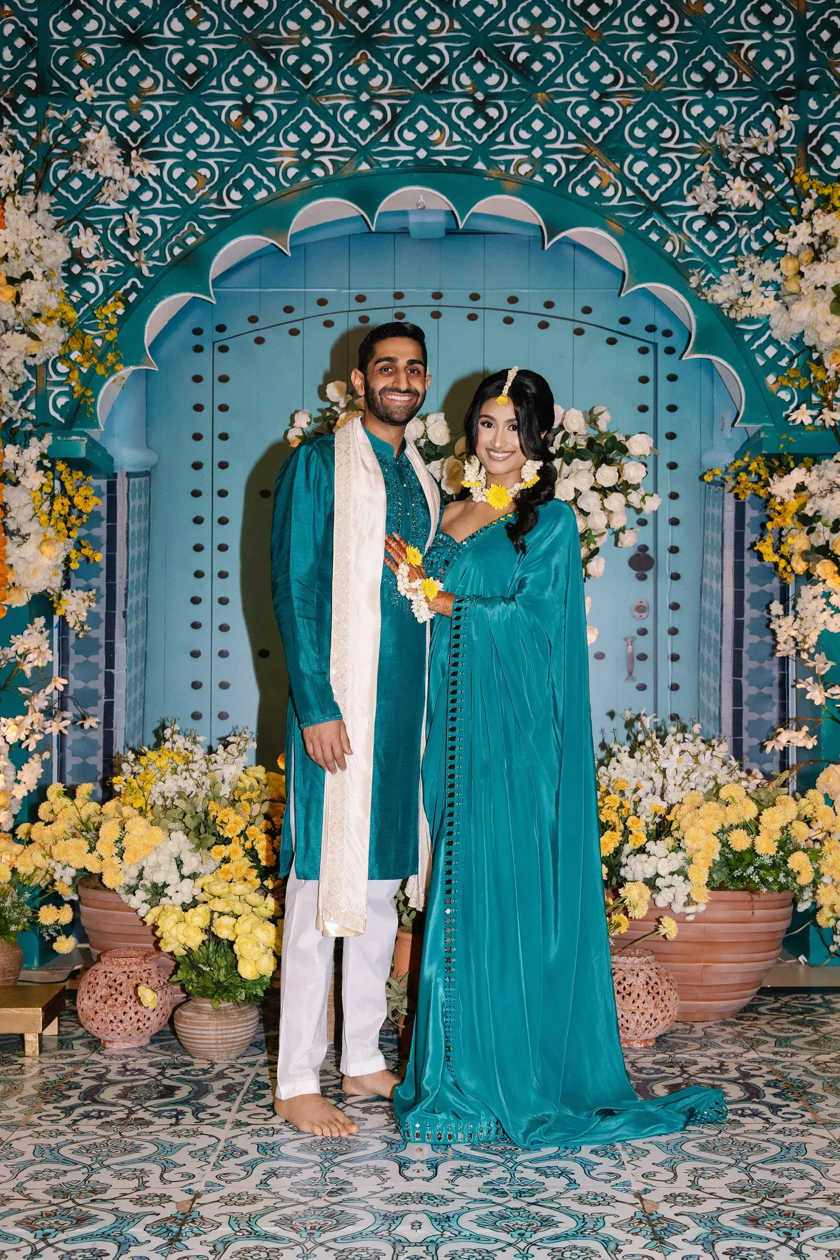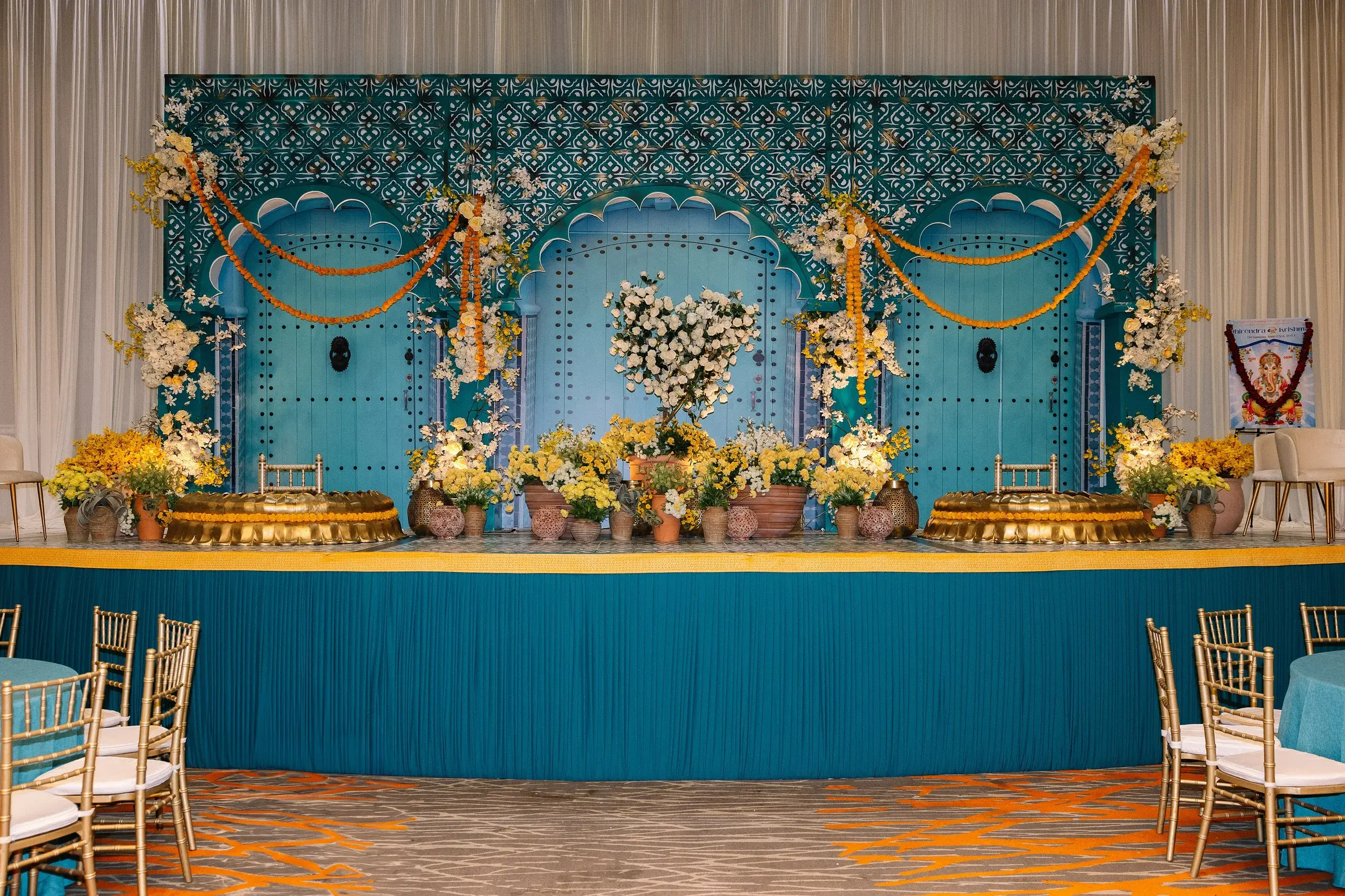 We began with the Couple’s Pithi, designed as a vibrant homage to their proposal in Chefchaouen, Morocco. The setting recreated the charm of the city’s iconic blue doors, reflecting both the couple’s personal love story and traditional South Asian rituals.