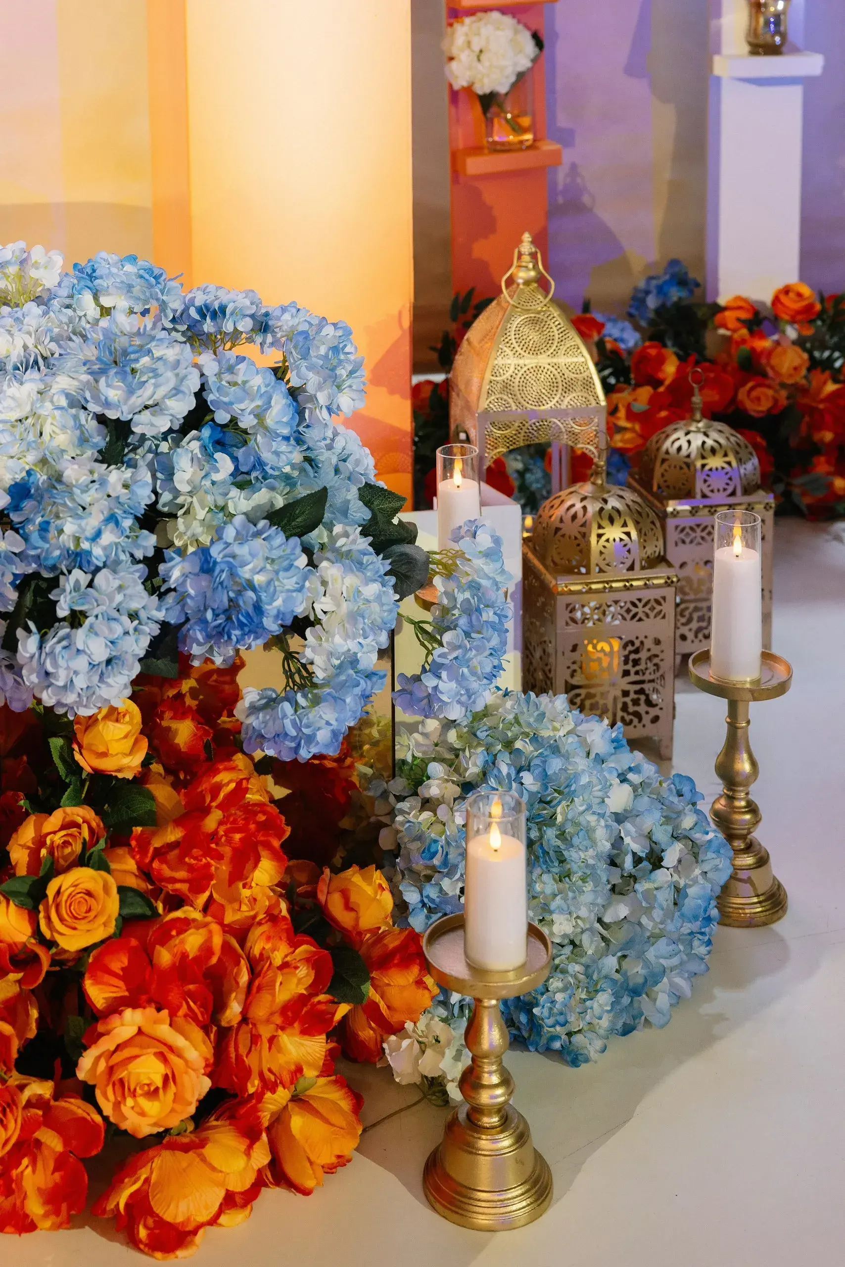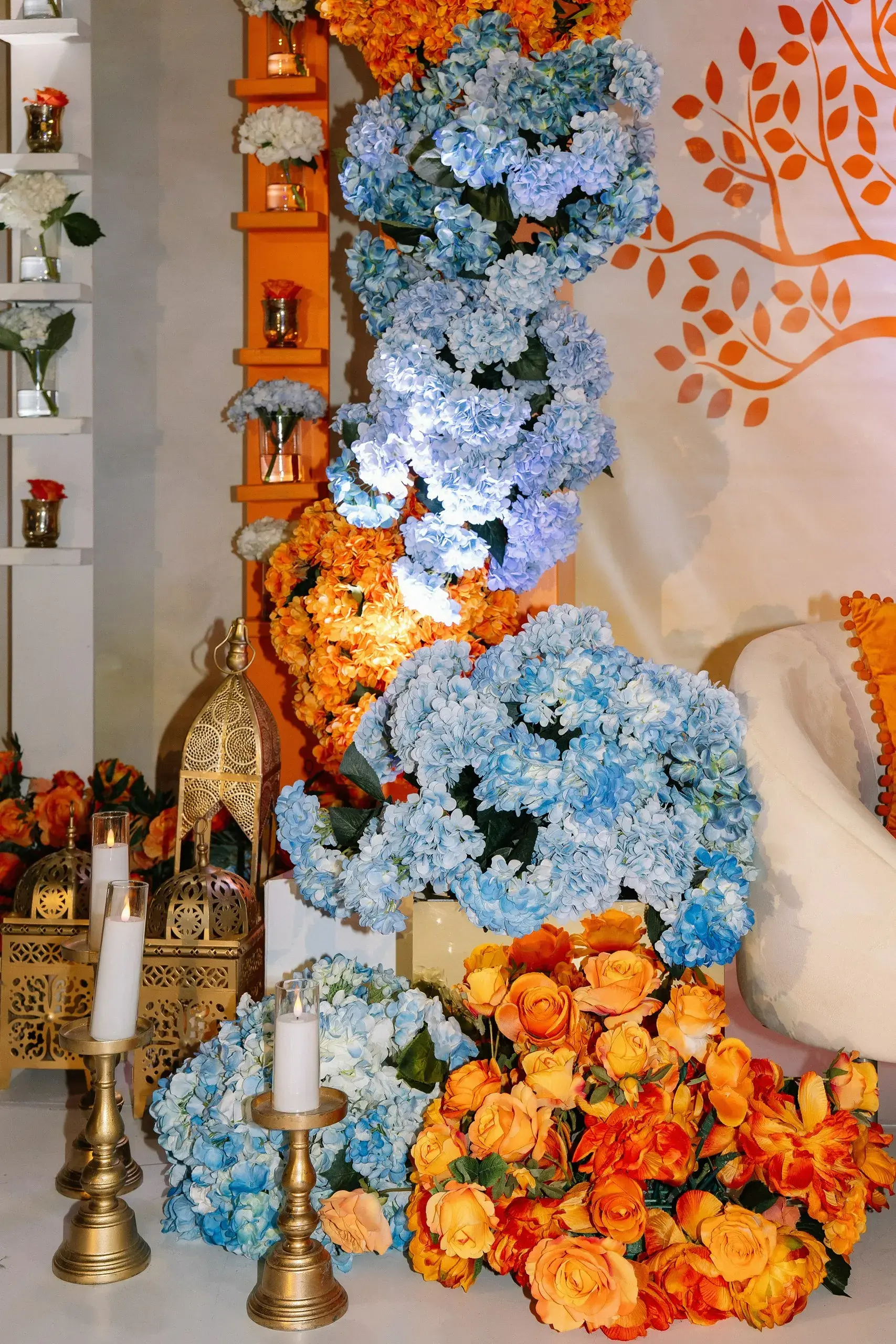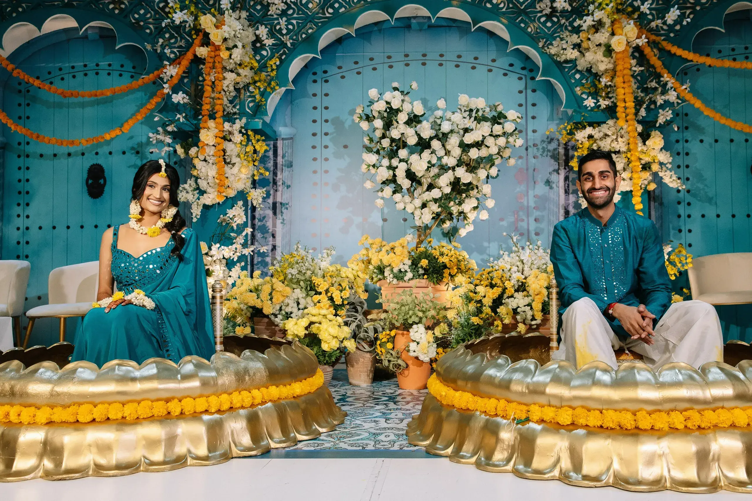 We began with the Couple’s Pithi, designed as a vibrant homage to their proposal in Chefchaouen, Morocco. The setting recreated the charm of the city’s iconic blue doors, reflecting both the couple’s personal love story and traditional South Asian rituals.