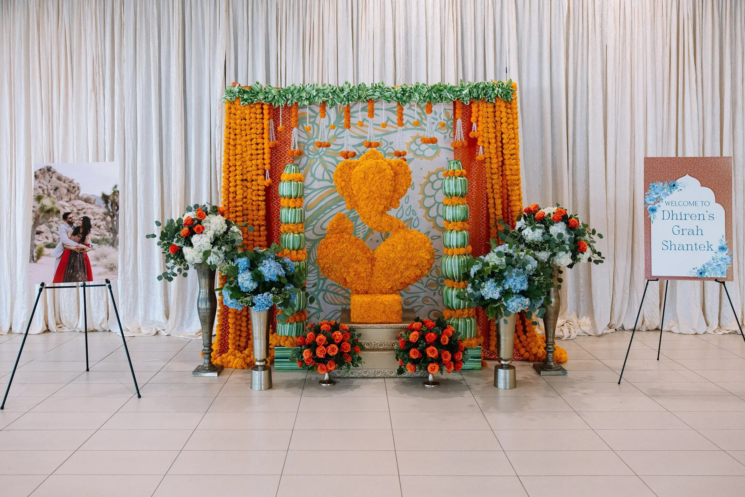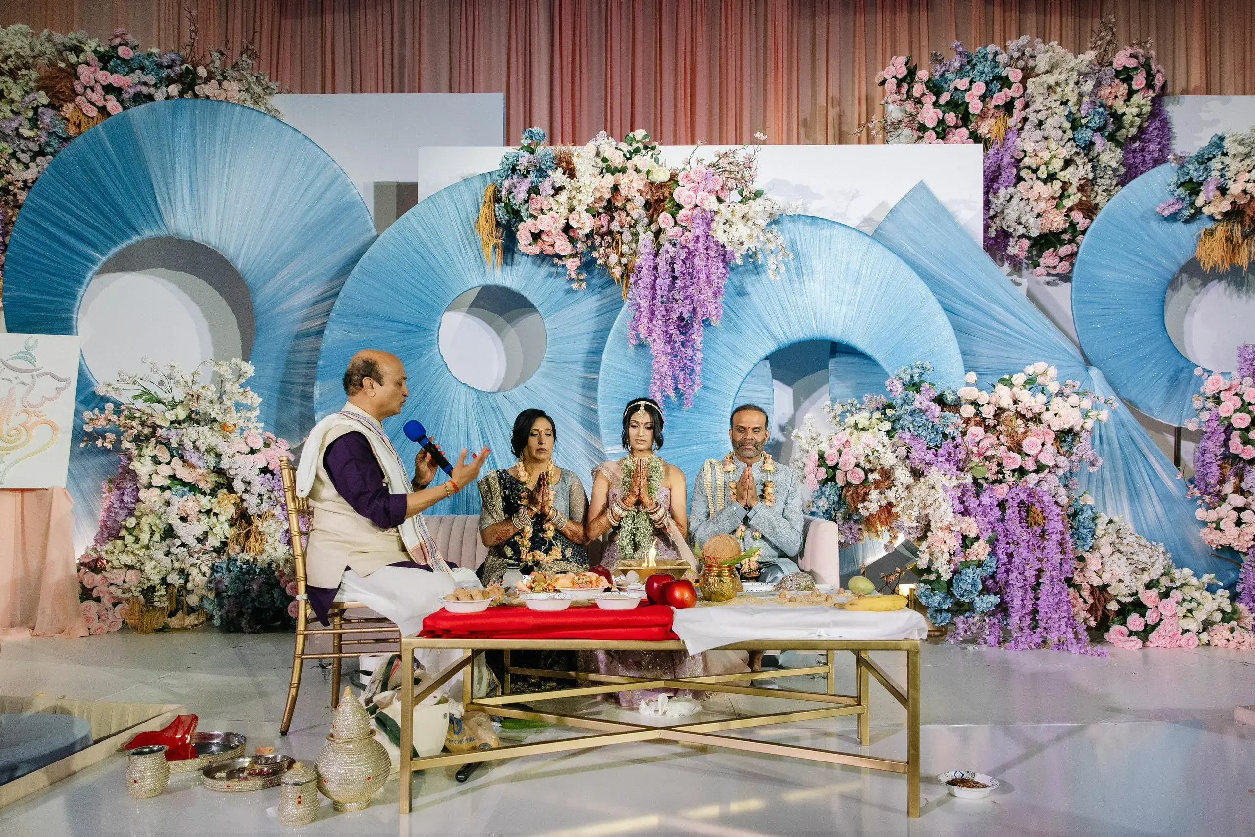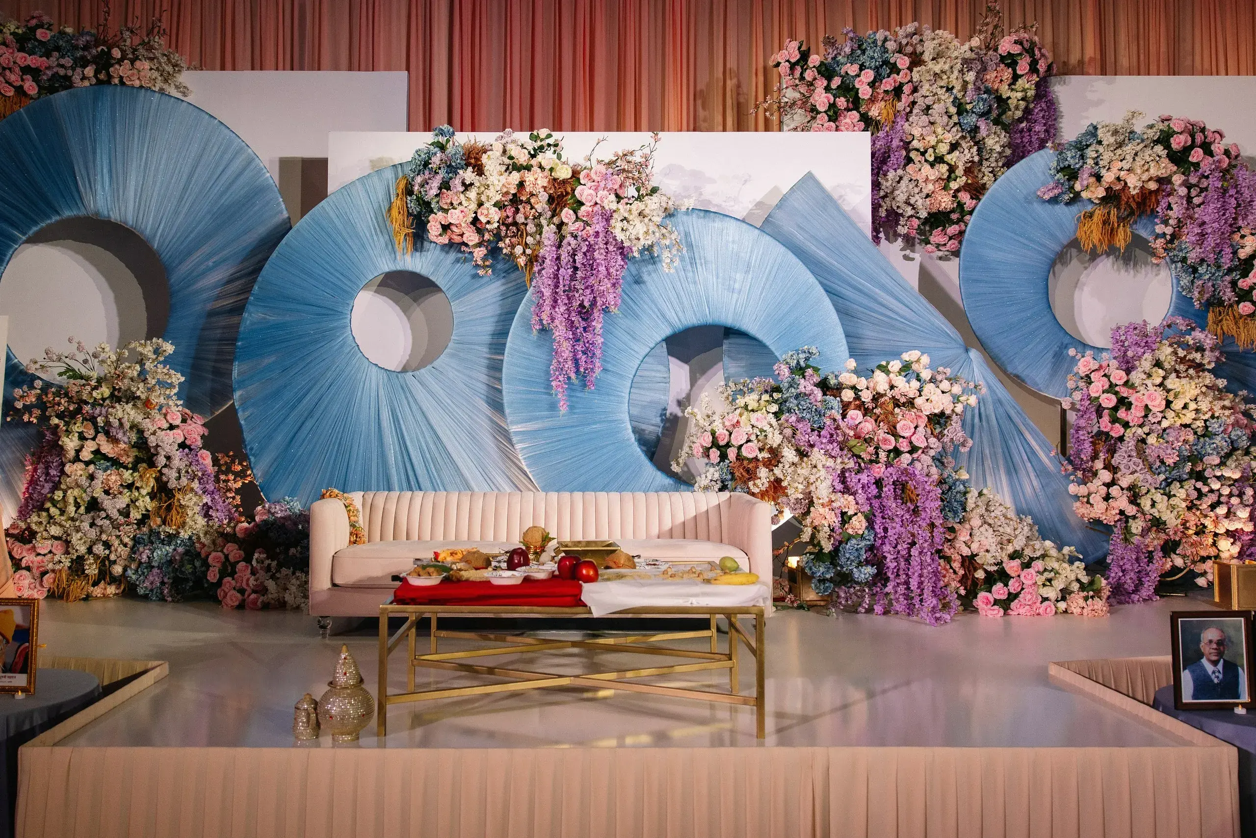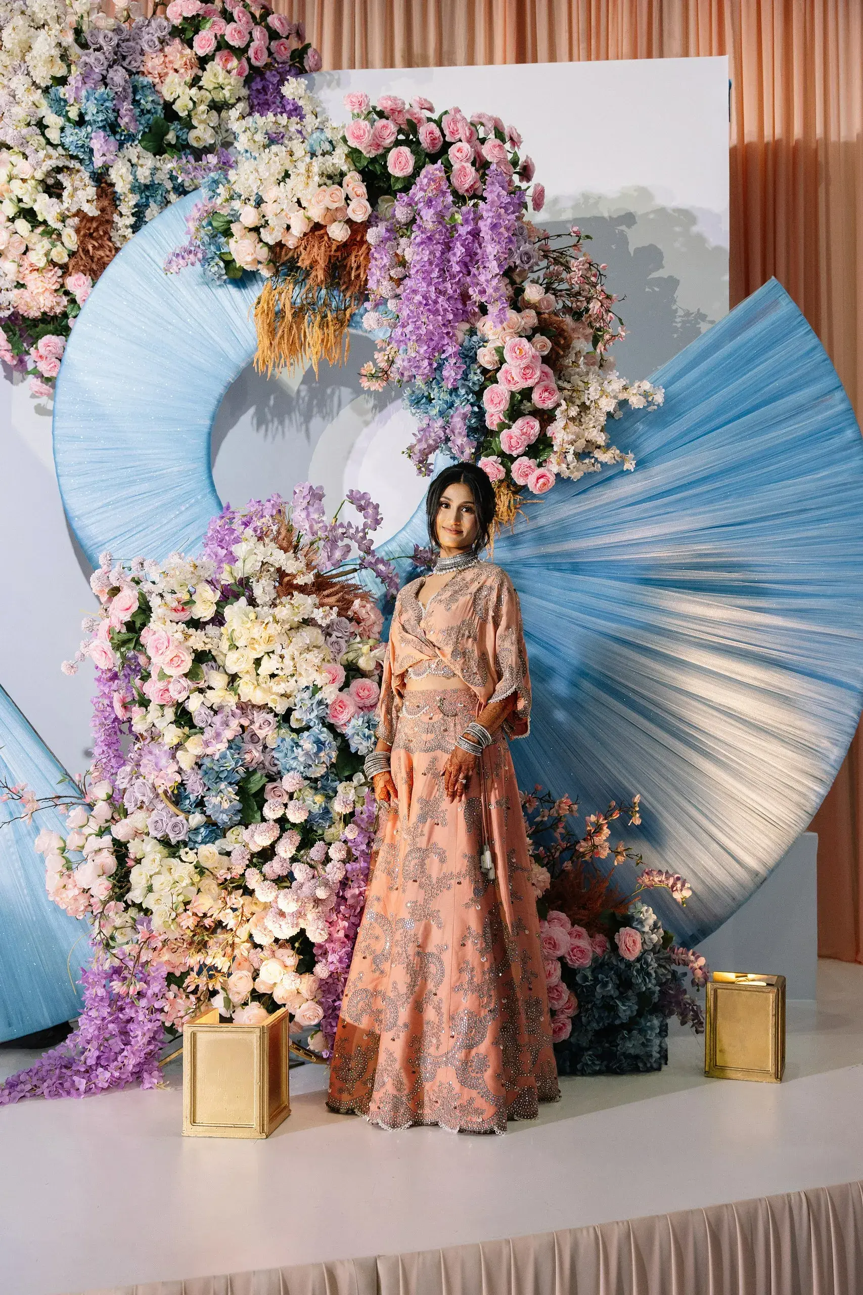 Their wedding ceremony was an elegant fusion of tradition and modernity. Set against tones of sage, muted blues, and soft neutrals, the mandap and floral installations honored South Asian rituals while feeling refreshingly contemporary and timeless.