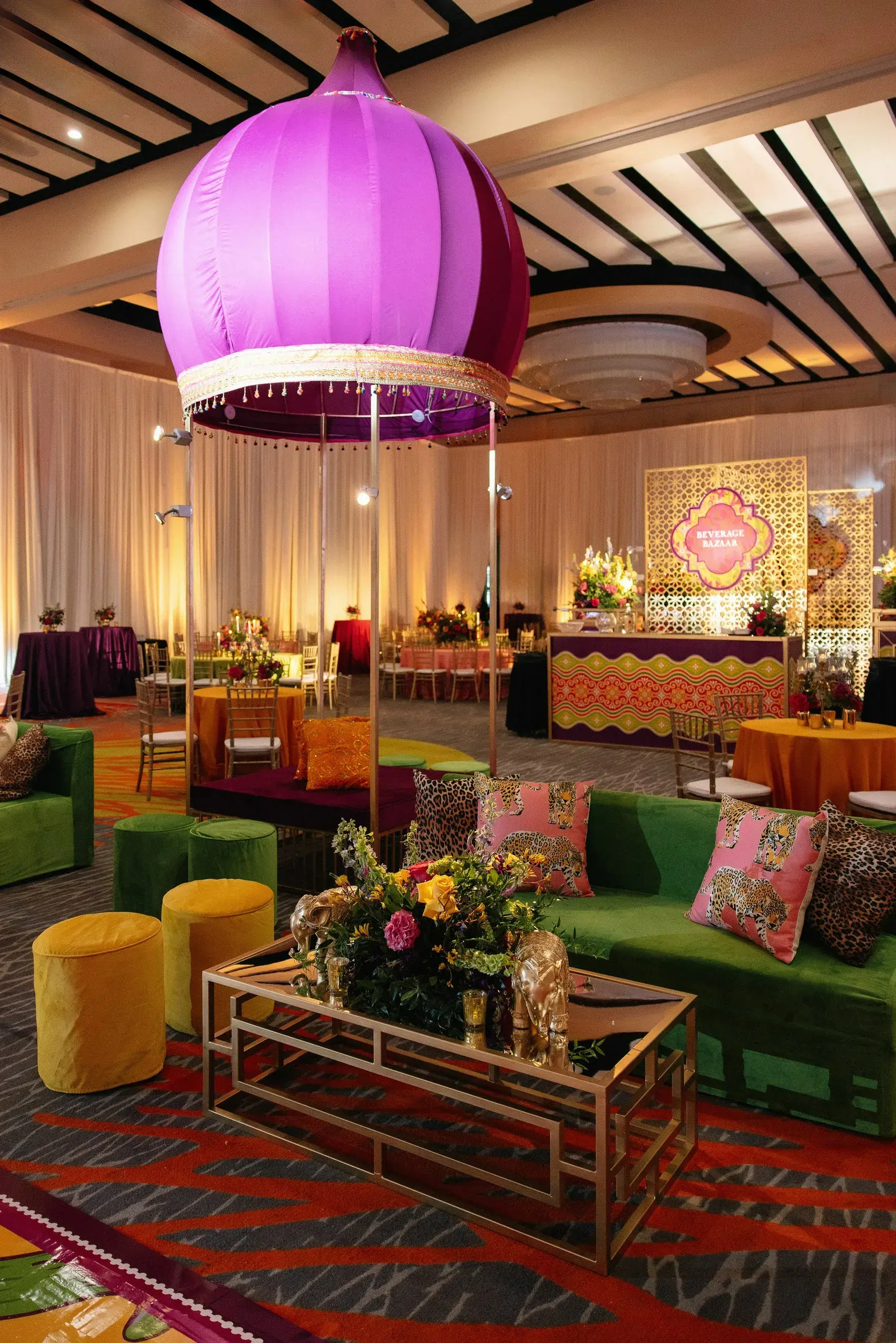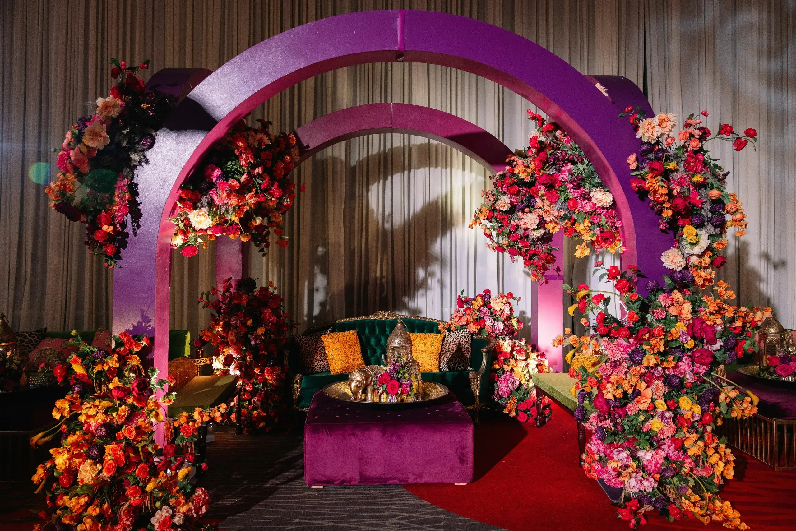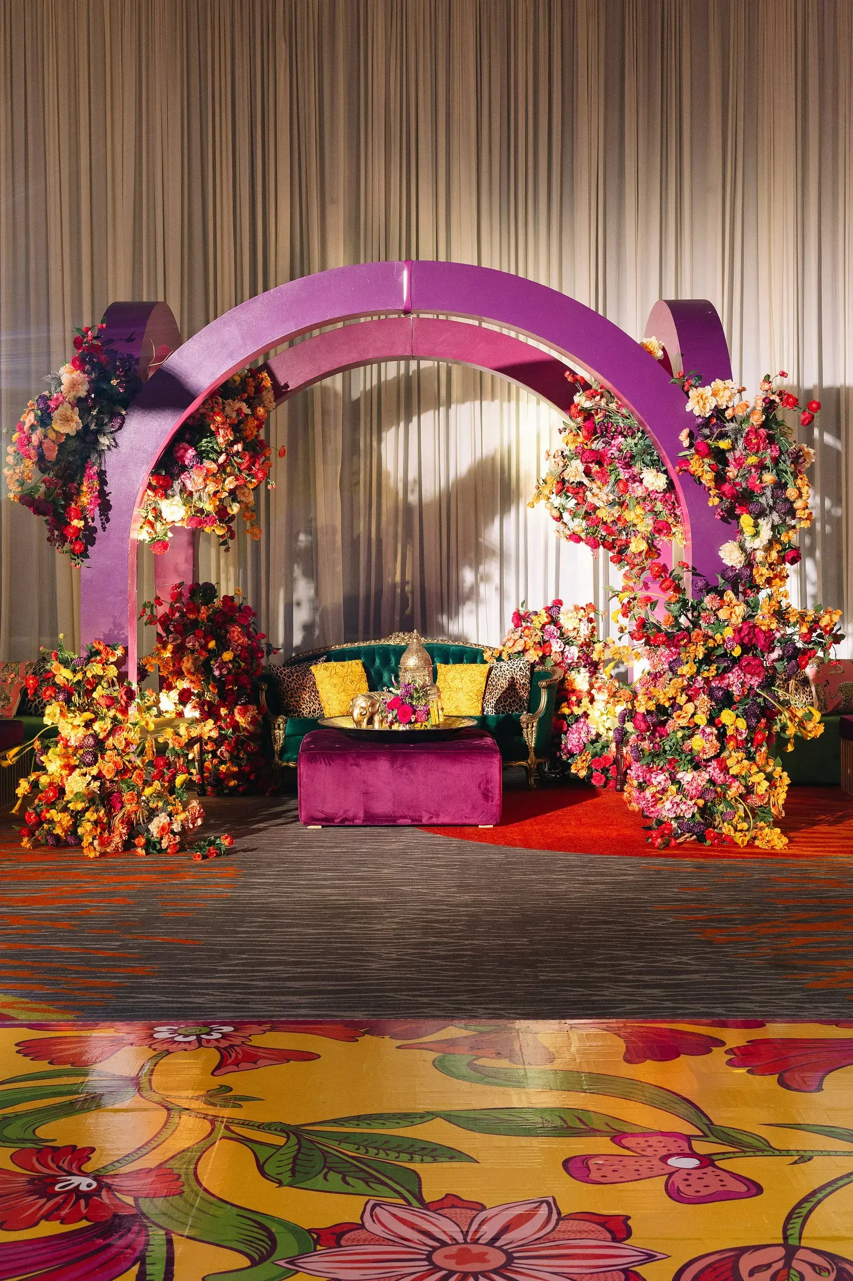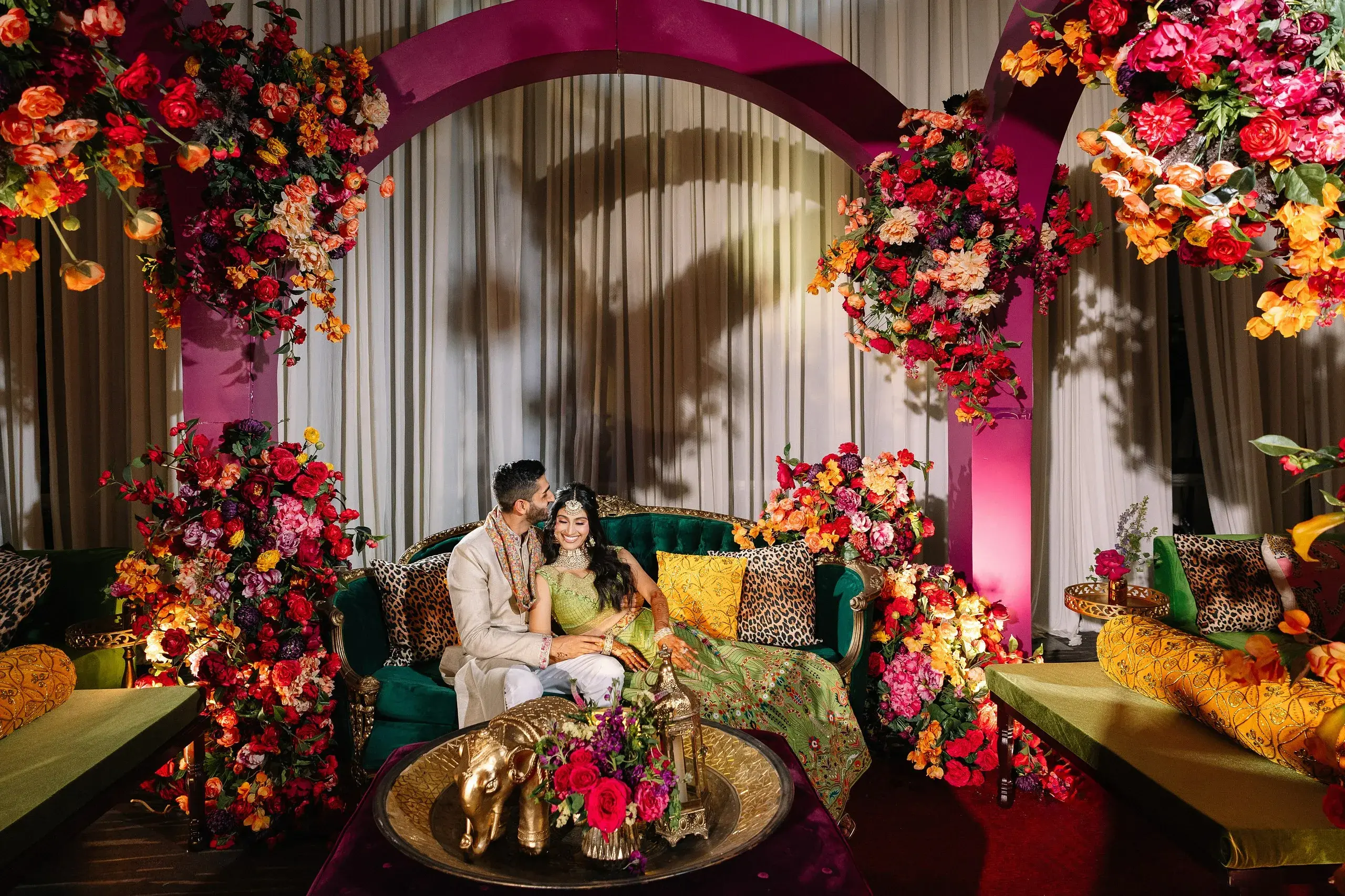 The next evening was the Mehndi, which merged South Asian heritage with high-fashion inspiration. Drawing cues from the Dior gateway to India fashion show, the celebration featured bold colors, intricate floral artistry, and modern design elements that highlighted the bride’s fashion-forward vision while staying rooted in cultural tradition.