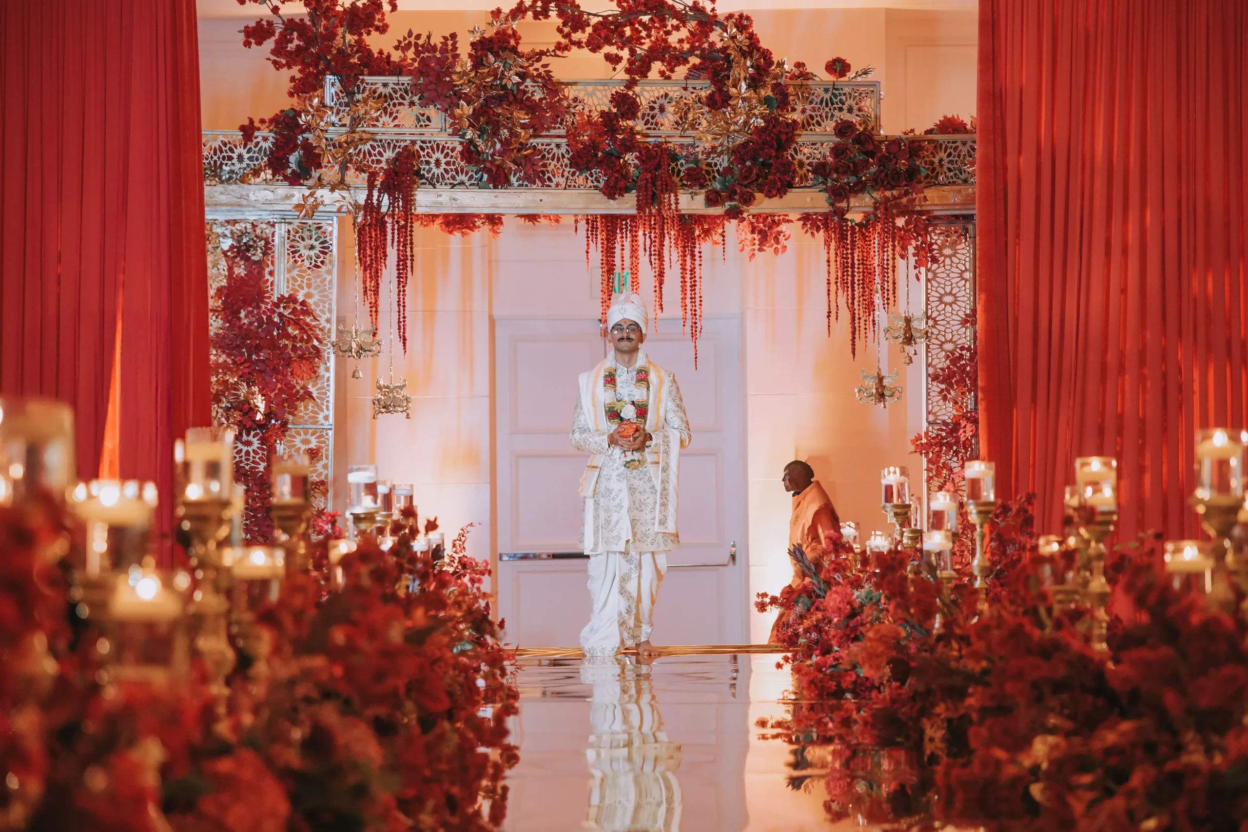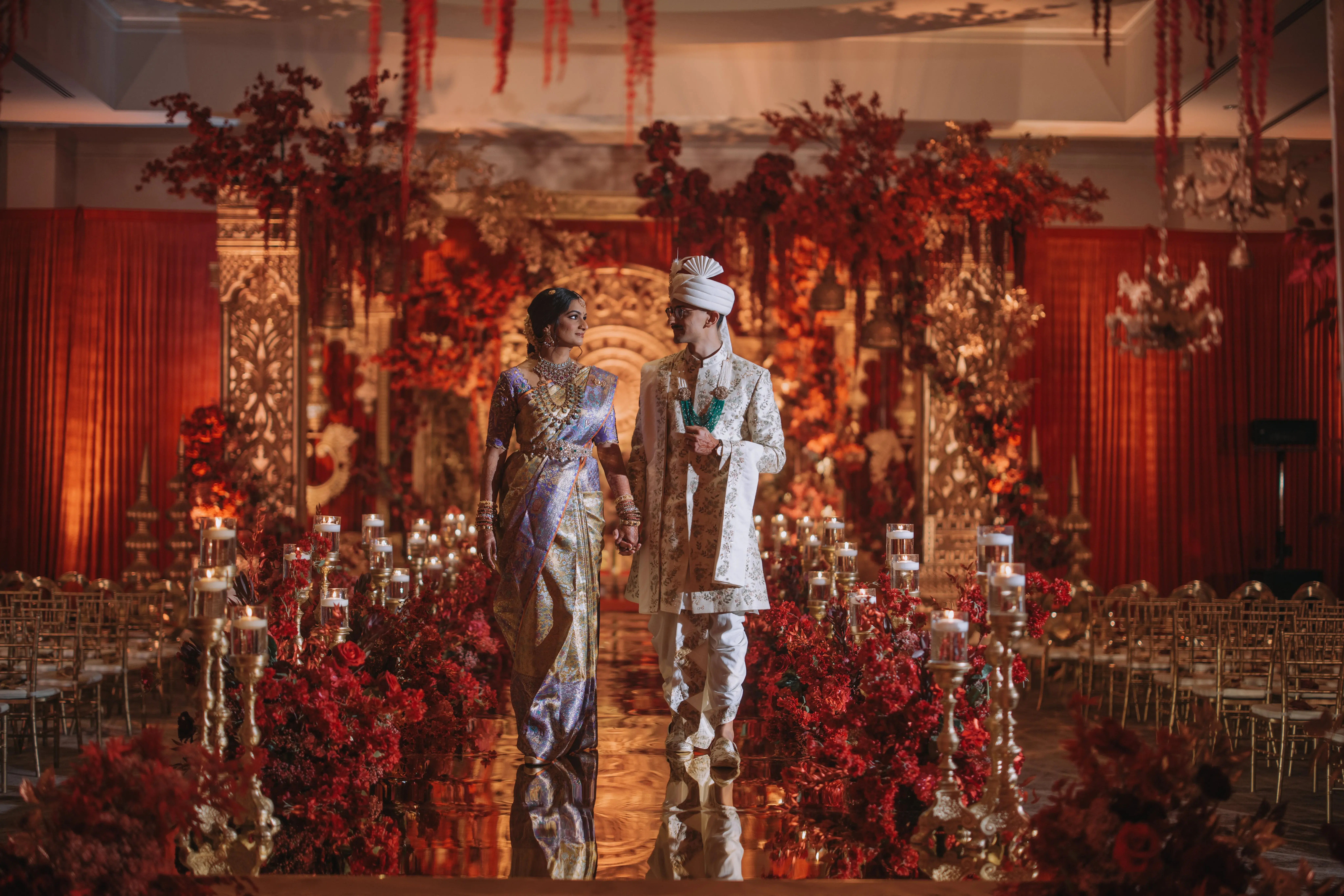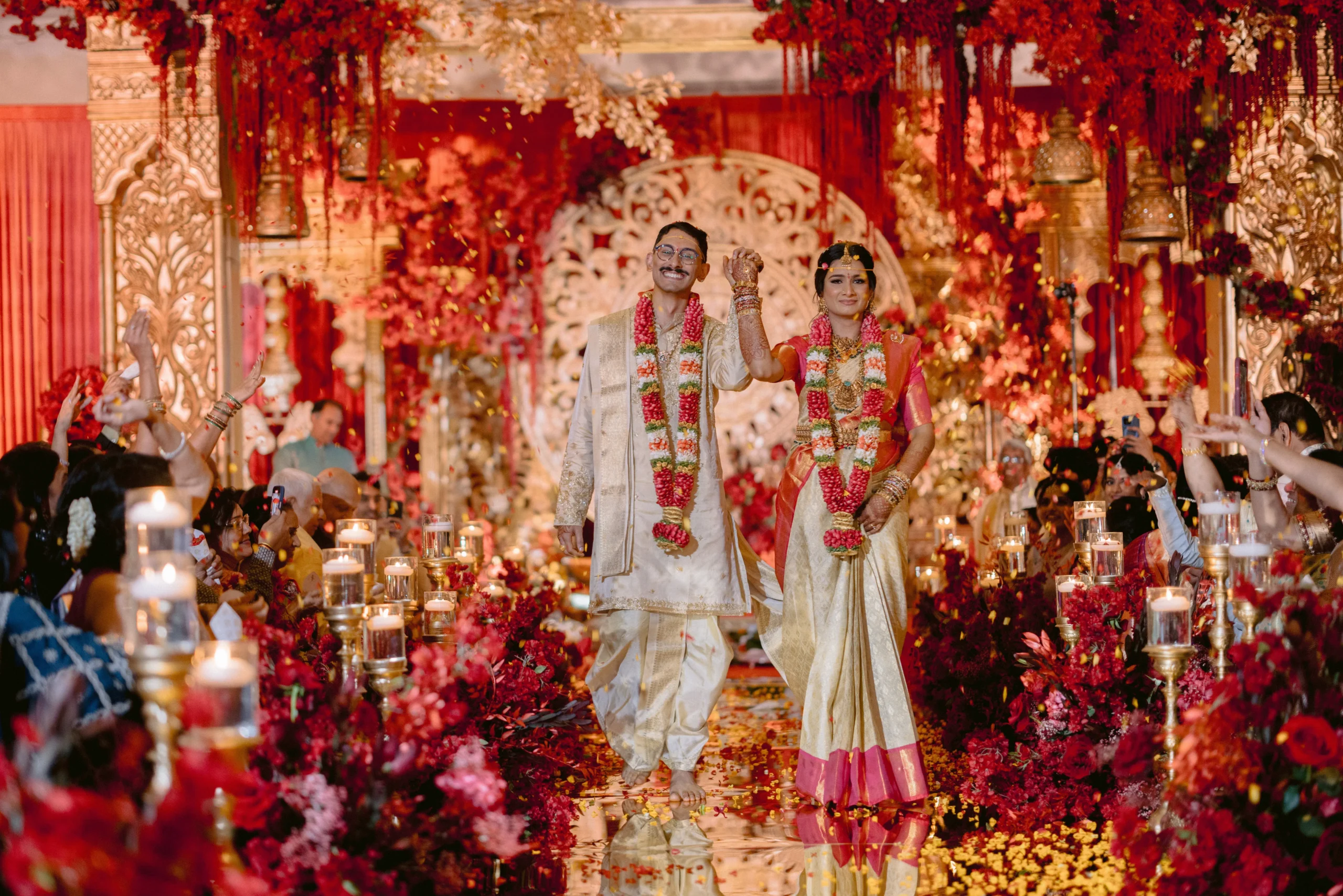 The wedding ceremony unfolded in a floral-draped ballroom mandap, symbolizing unity and authenticity. A deeply emotional highlight was the first look, where Jay surprised Swetha with a handwritten letter, a private moment beautifully preserved through the lens.